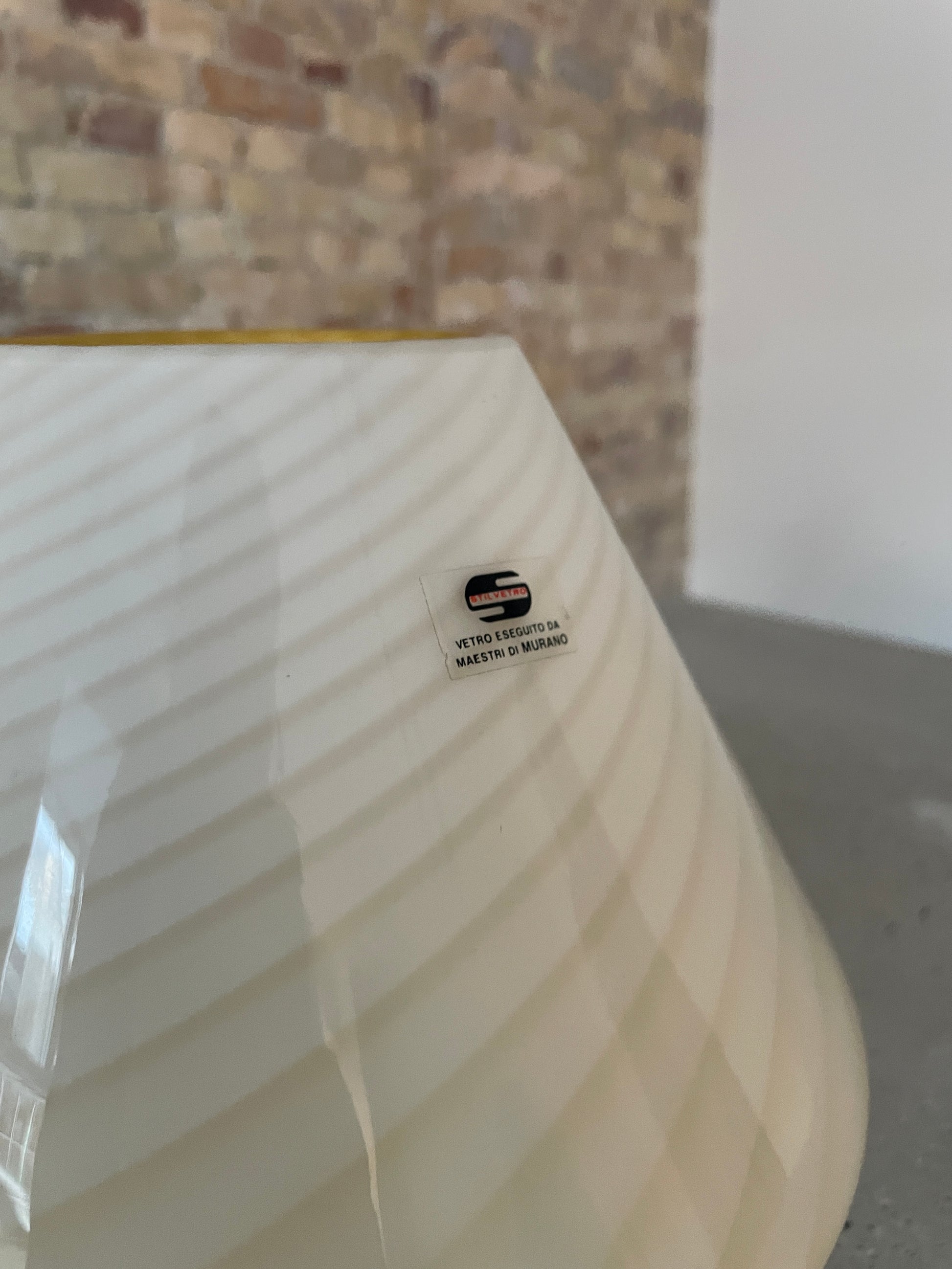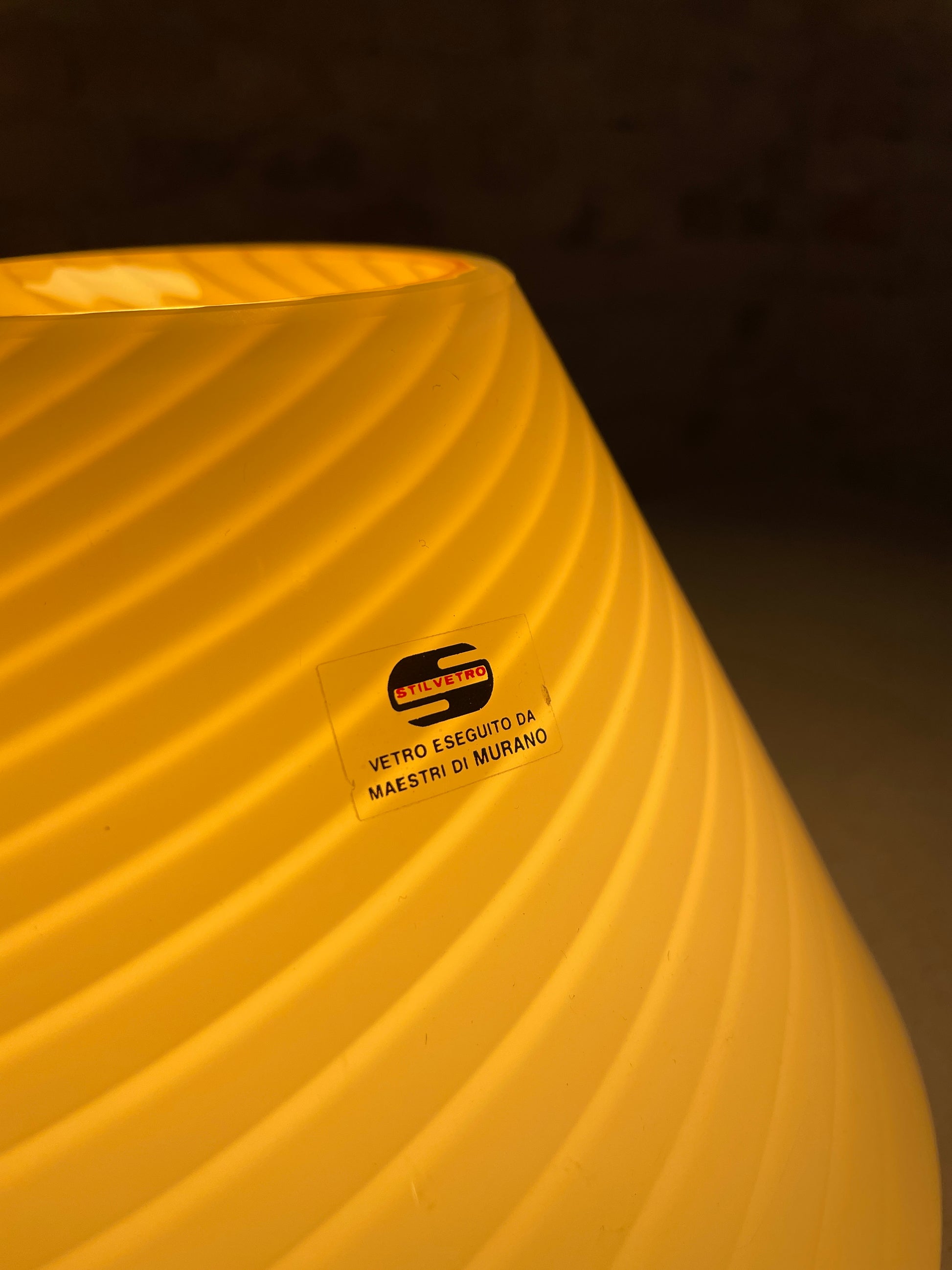 Most beautiful vintage Murano mushroom with cream colored glass and the most beautiful swirl. Also note the original Murano sticker on the table lamp.