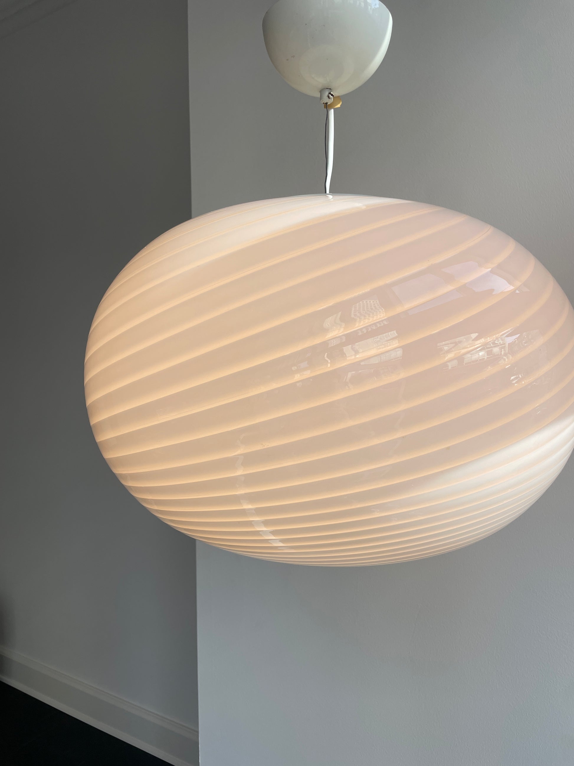 Huge, white vintage oval Murano pendant with elegant white top. Note the extraordinary swirl!