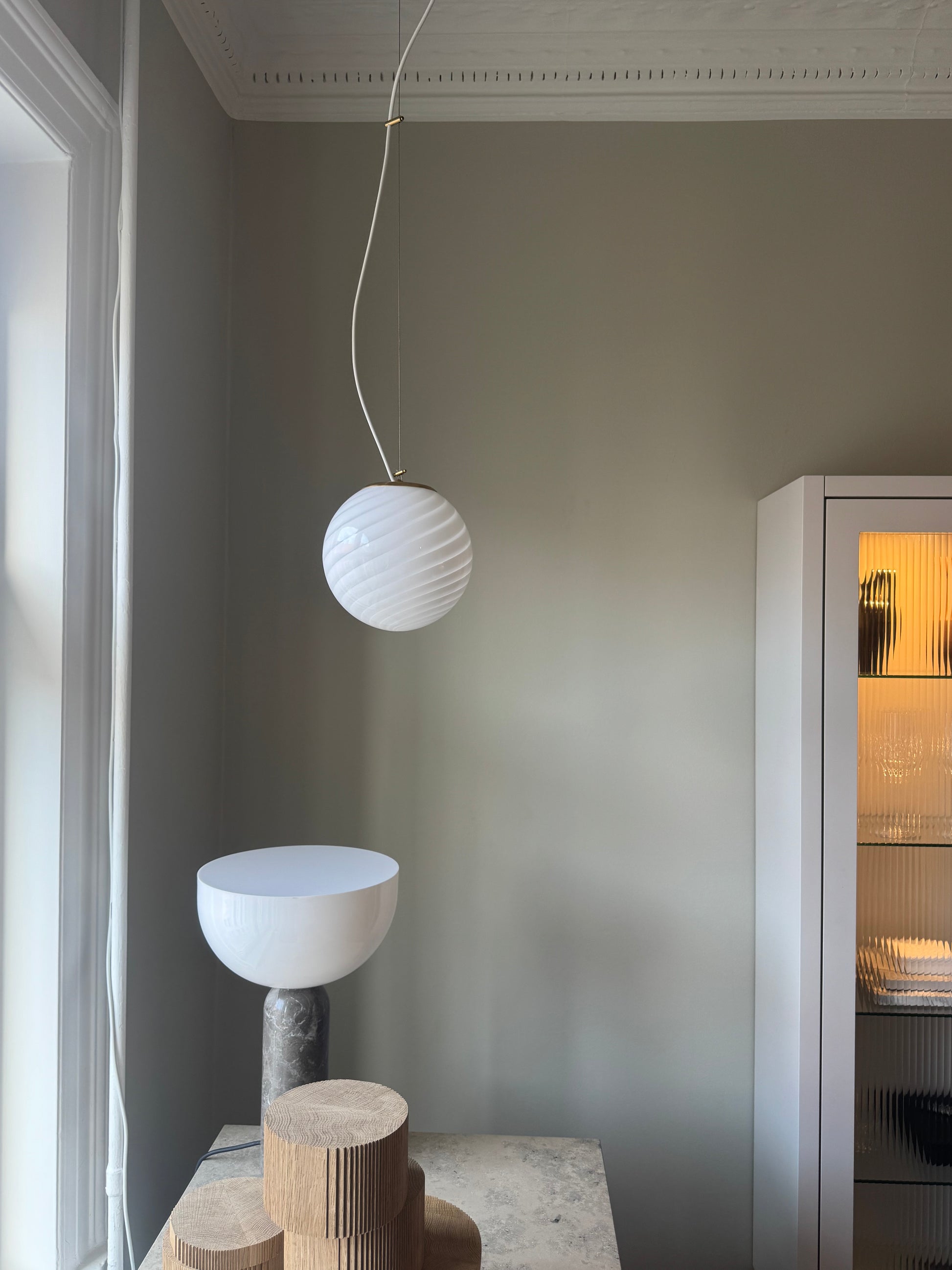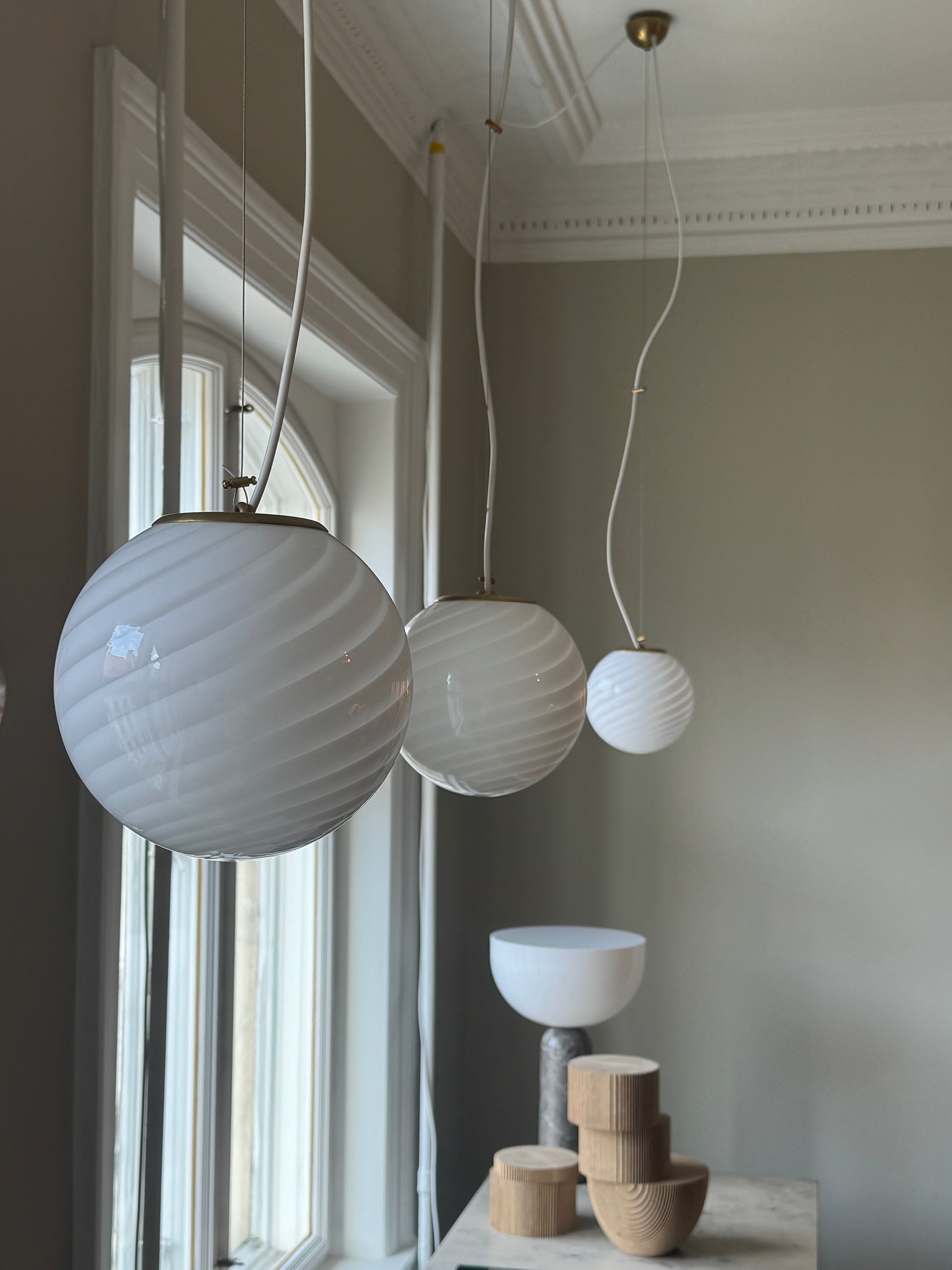 Smukkeste hvide Murano pendel med den klassiske swirl. Vi har flere på lager af denne type, og den kommer med et fint patineret messing ophæng. Vi har dem selv hængende i køkkenet og de er fantastisk smukke!