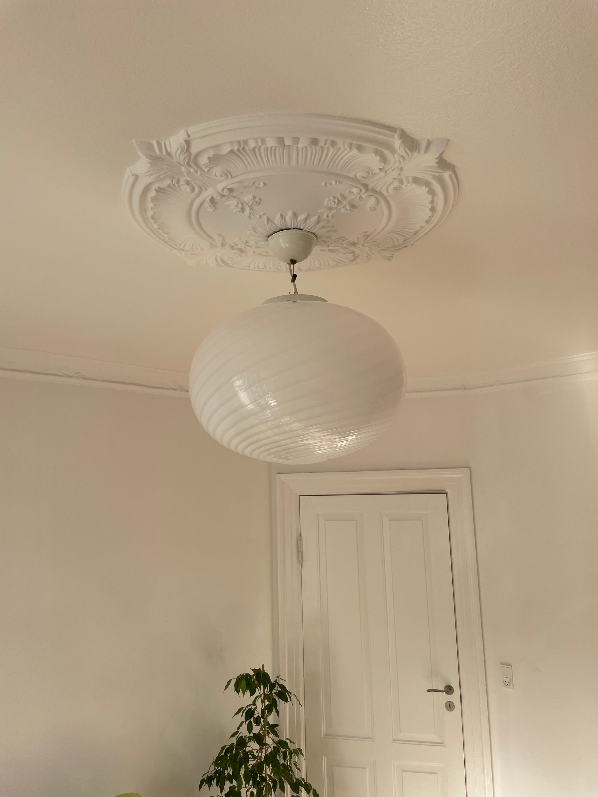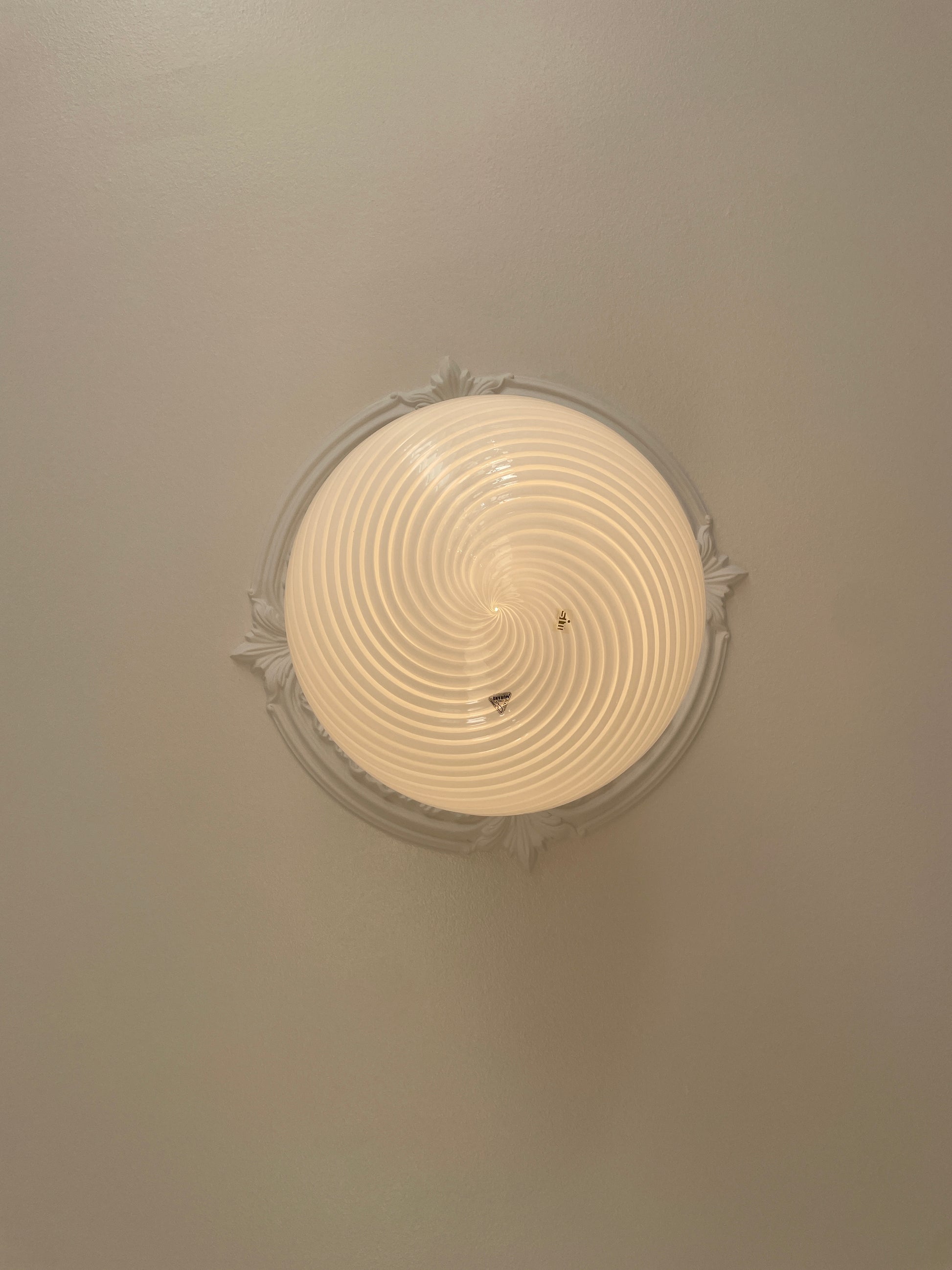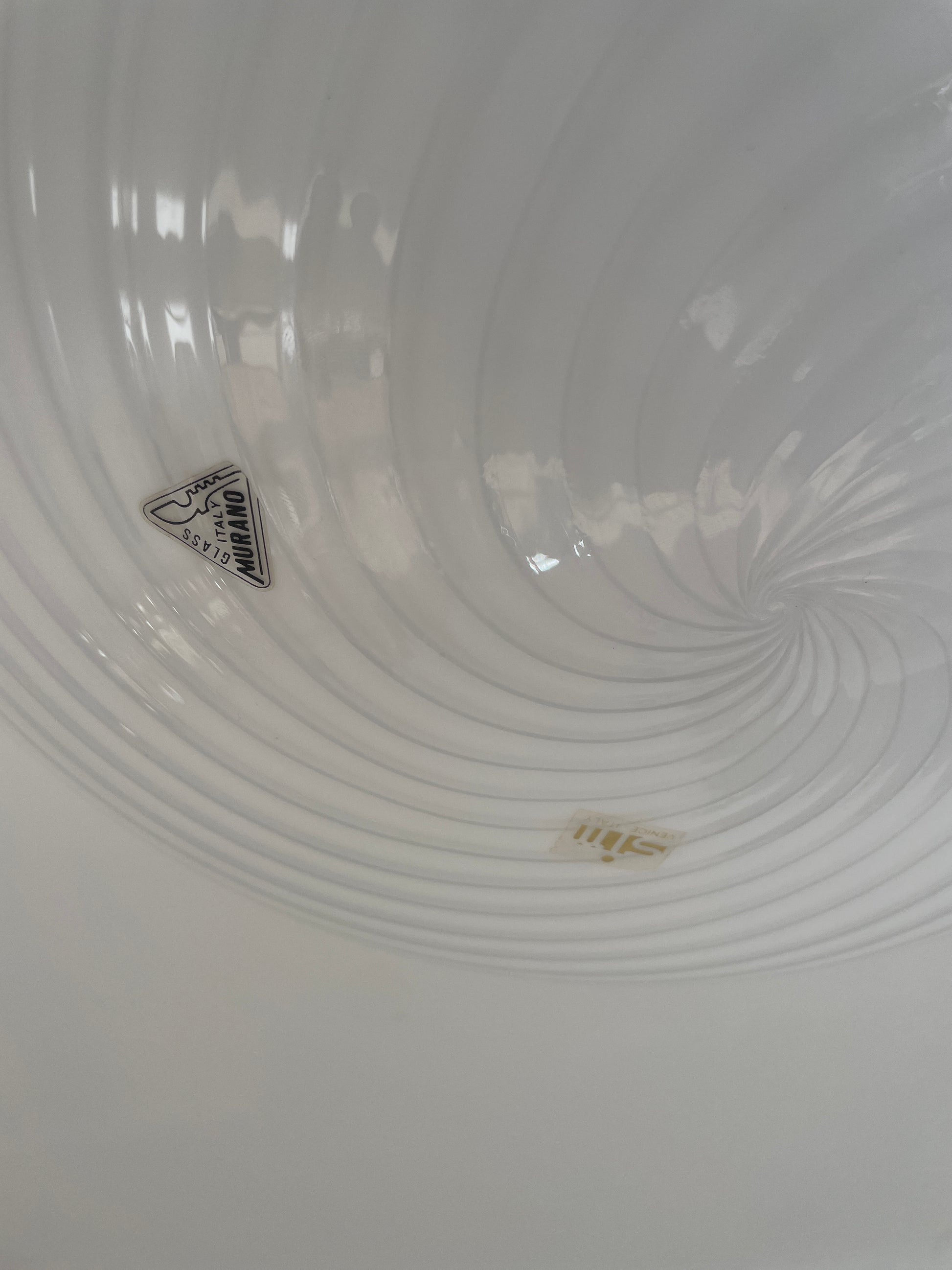 Kæmpe, hvid vintage oval Murano pendel med elegant hvid top. Bemærk den ekstraordinære flotte swirl samt originale sticker.