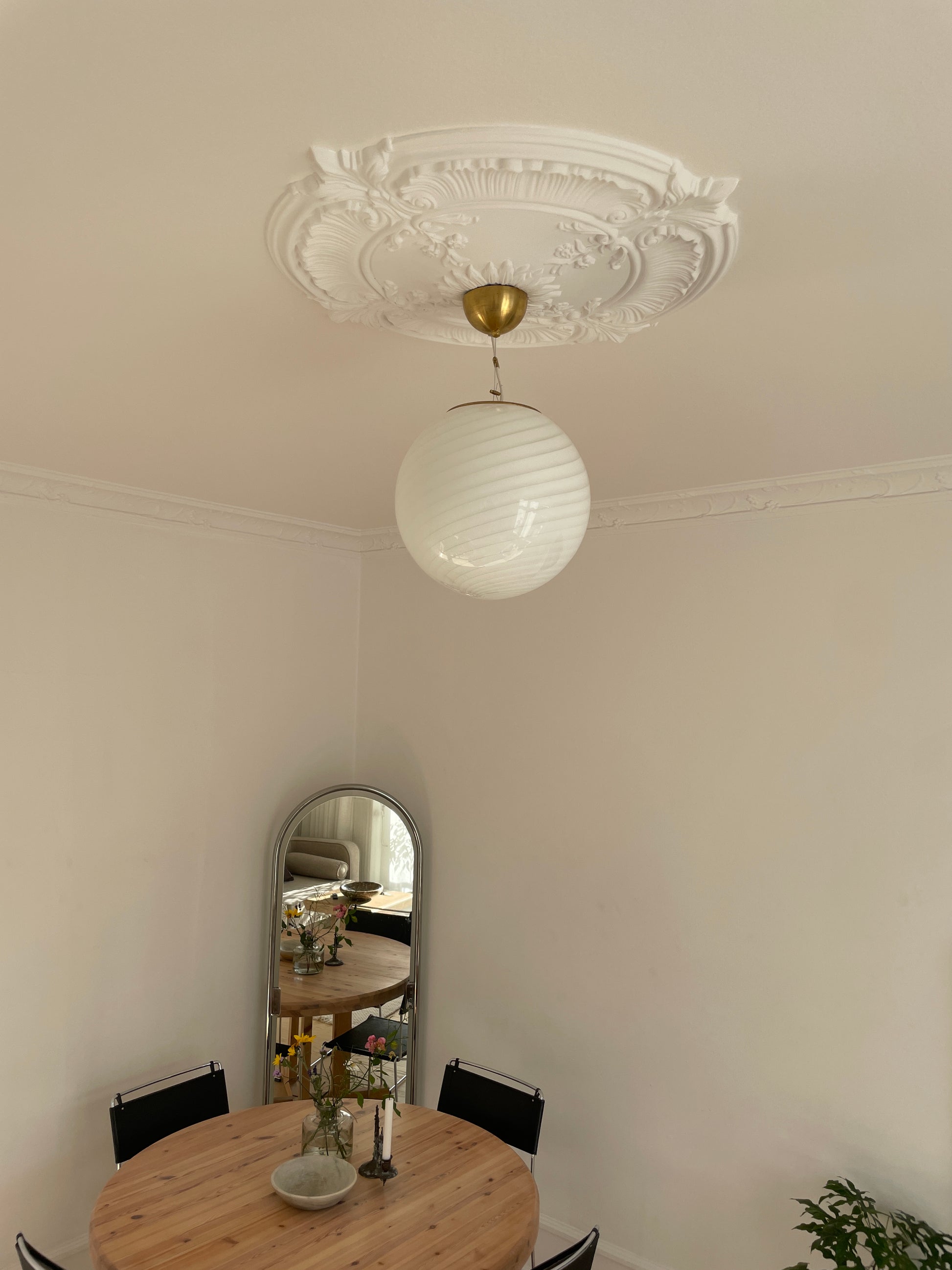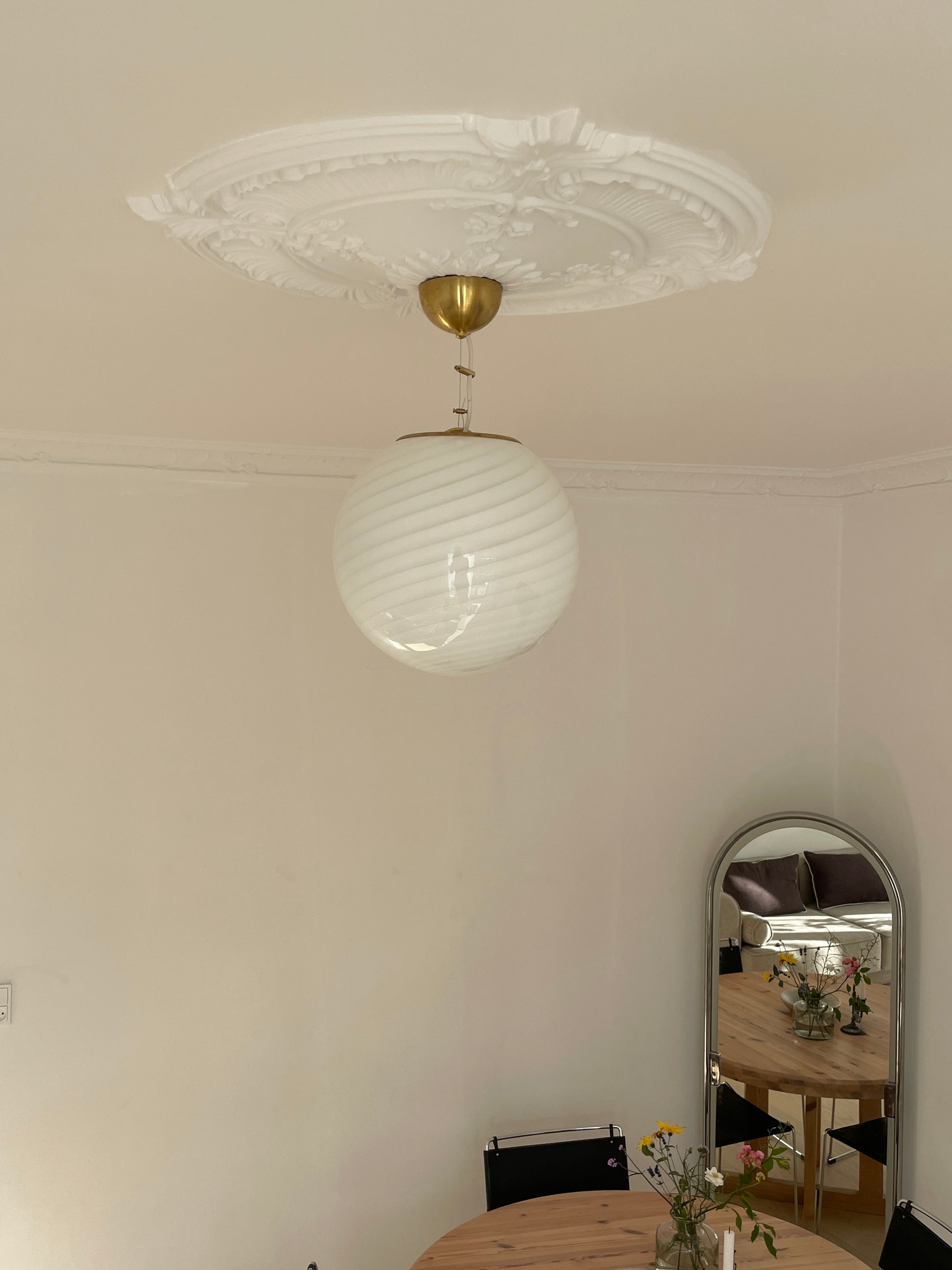 Smuk hvid vintage Murano pendel i rund klassisk form. Den har tilmed en smuk messing top og en størrelse på 30 cm.