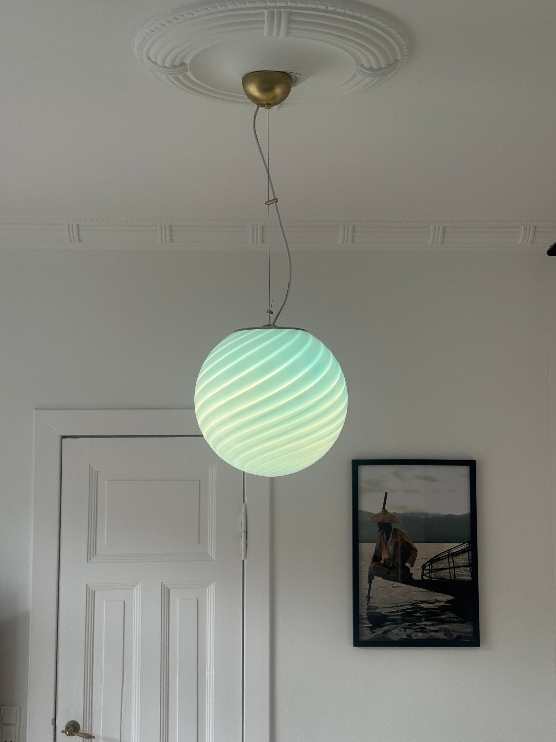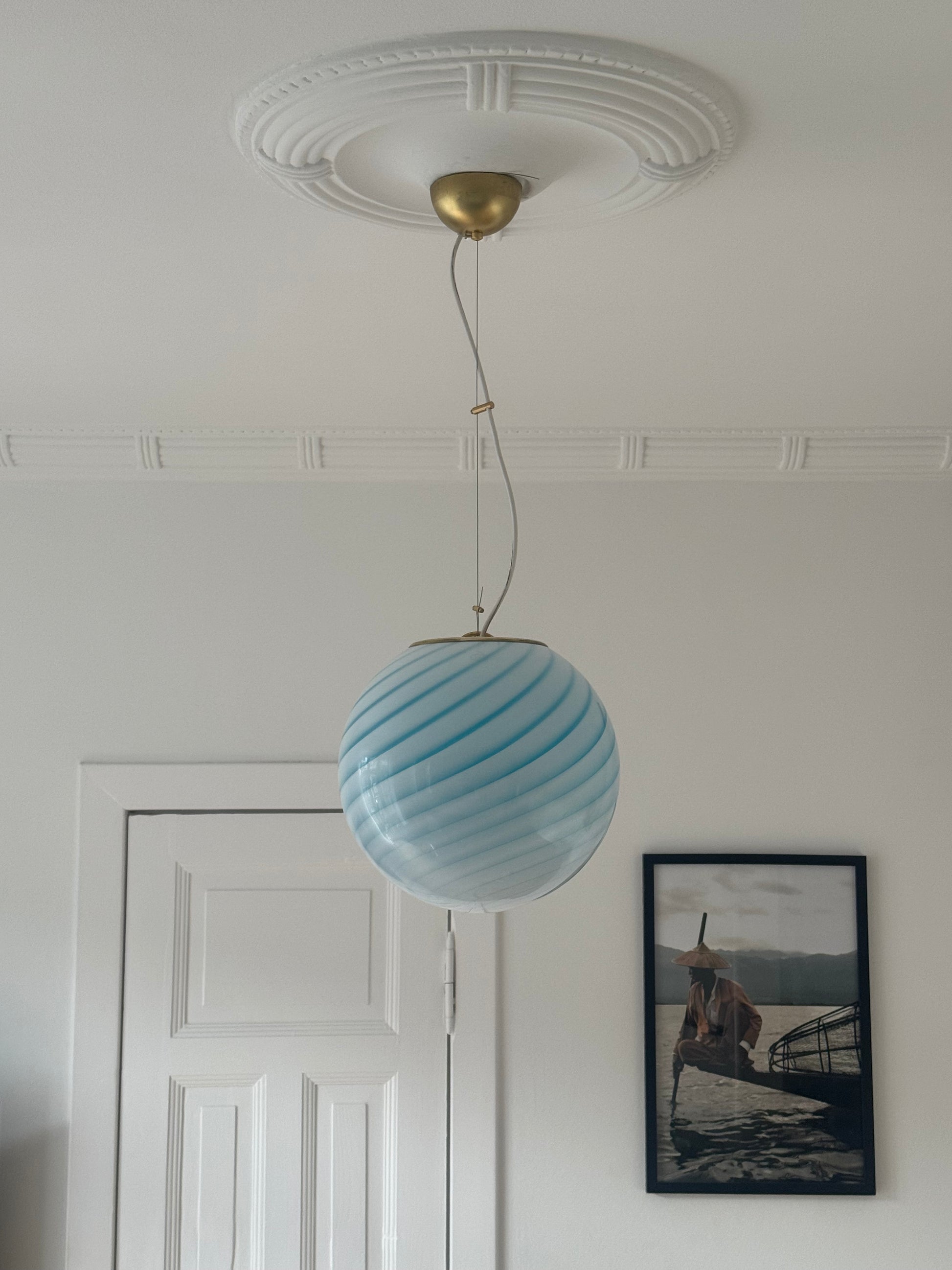 Murano rund pendel med blå swirl og messing top, 30 cm