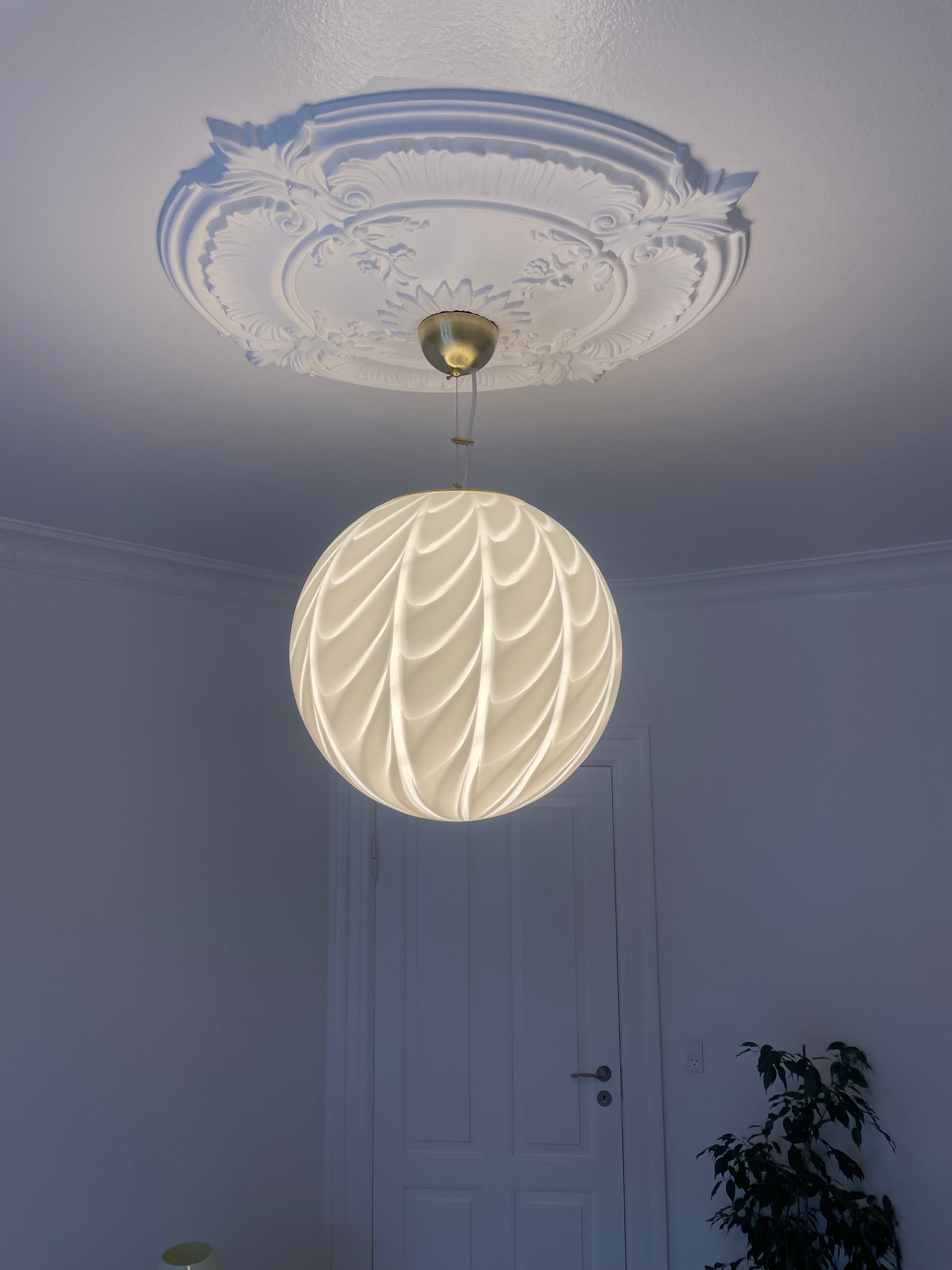 Smuk Murano loftslampe i hvidt bredt peacock-mønster. Der medfølger et flot ophæng i patineret messing.
