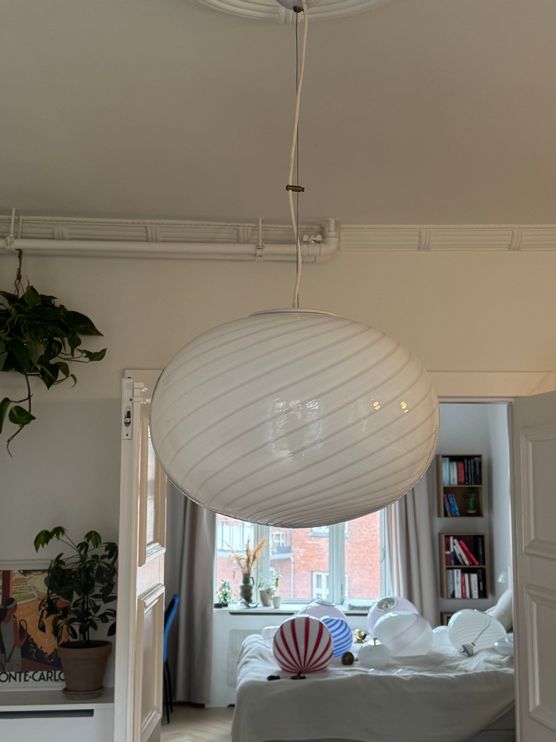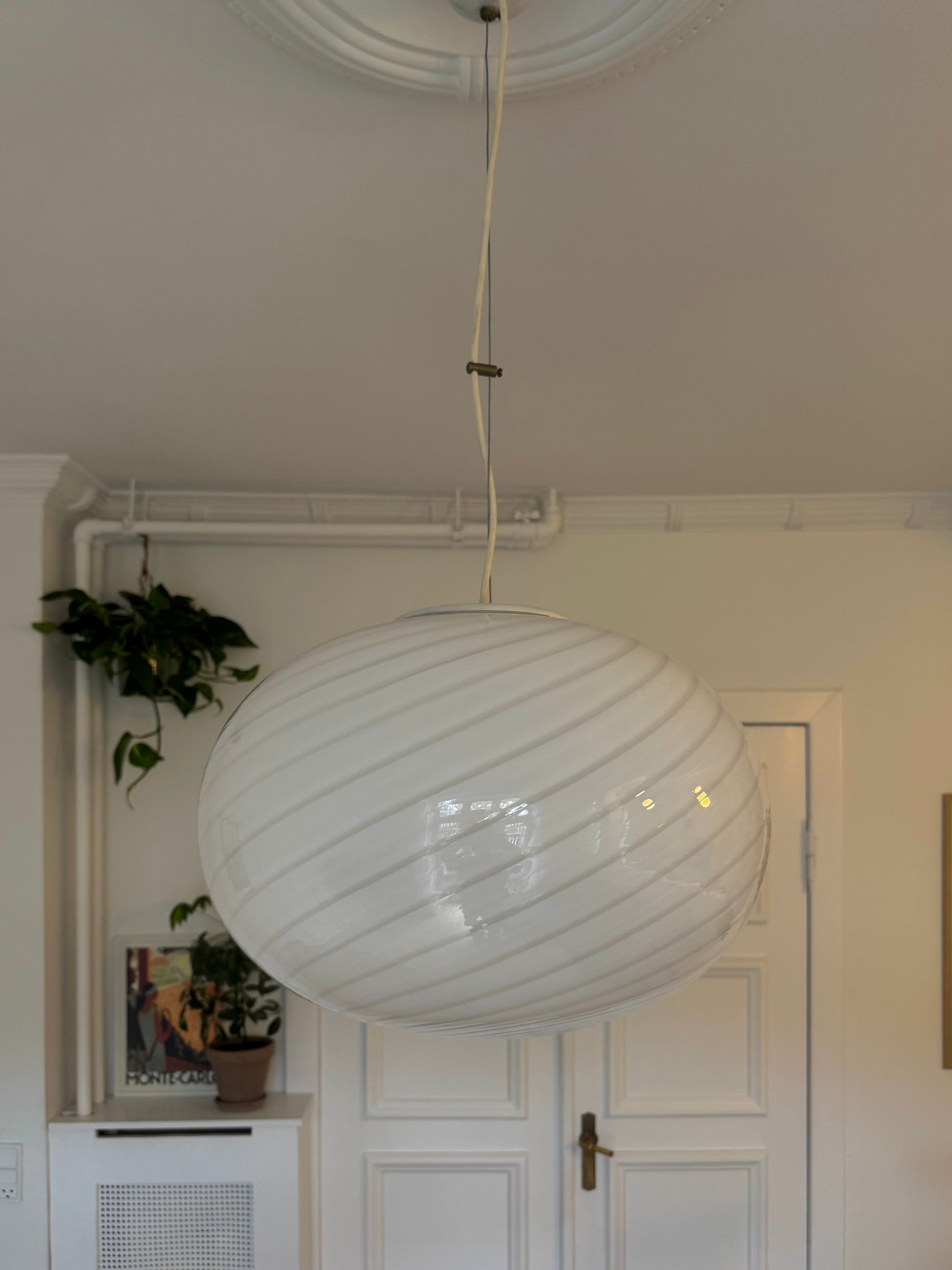 Murano pendel oval og i klassisk hvid swirl, 44 cm