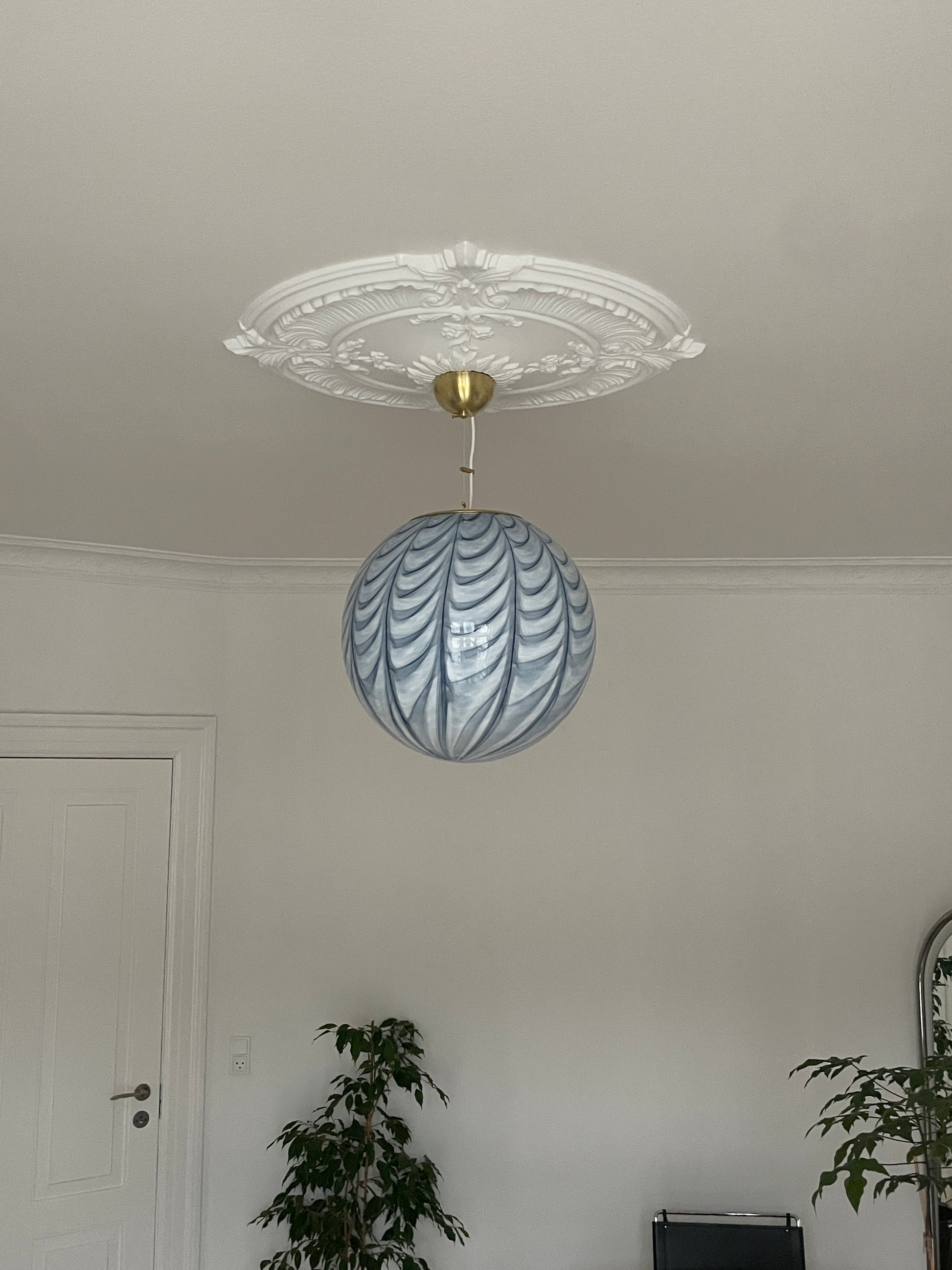 Kæmpe Murano peacock pendel i den flotteste blå farve og et rigtig fint ophæng i patineret messing. Bemærk det smukkeste brede peacock mønster.