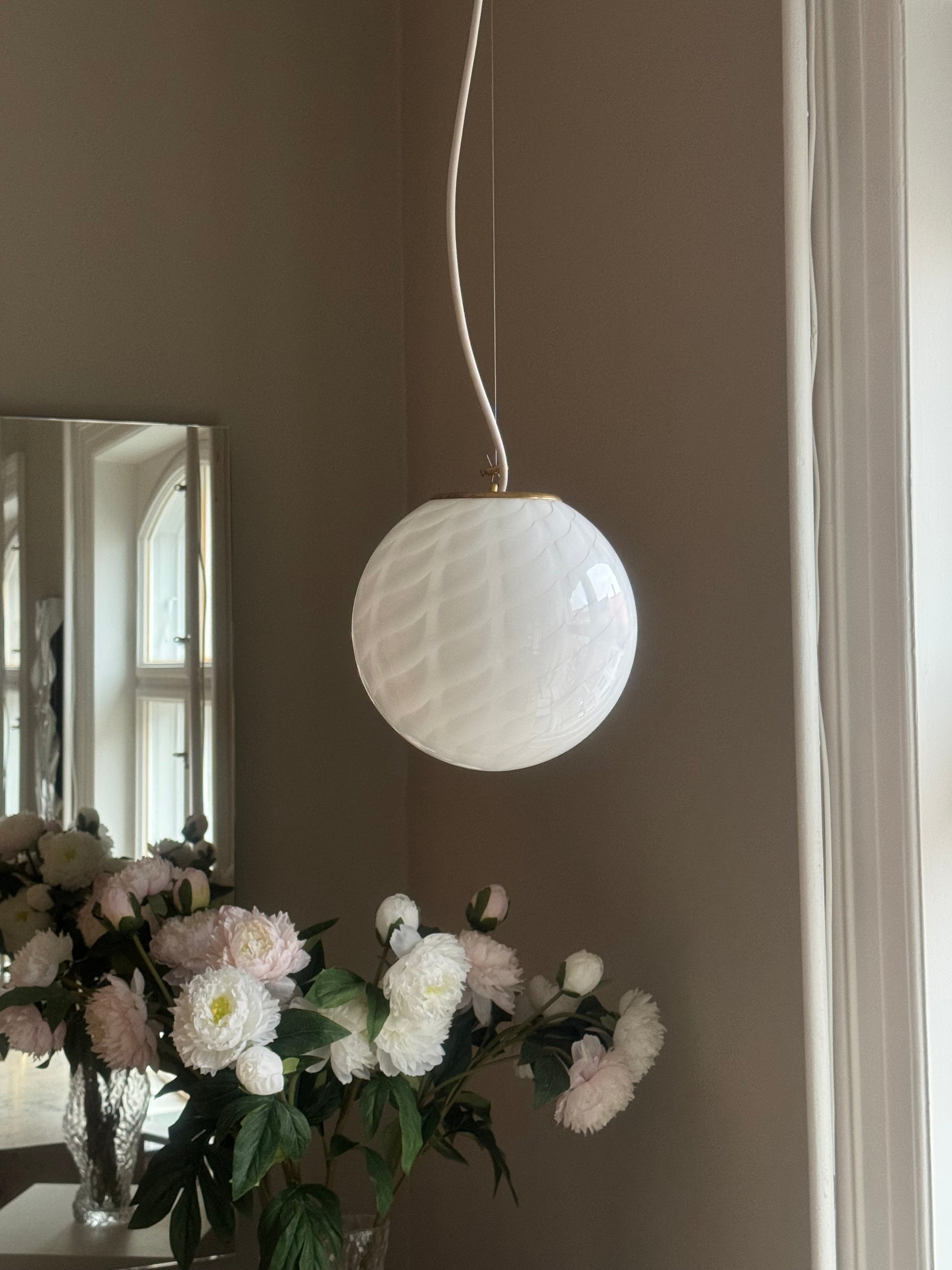 Smukkeste hvide Murano pendel med peacock swirl. Vi har flere på lager af denne type, og den kommer med et fint patineret messingophæng.