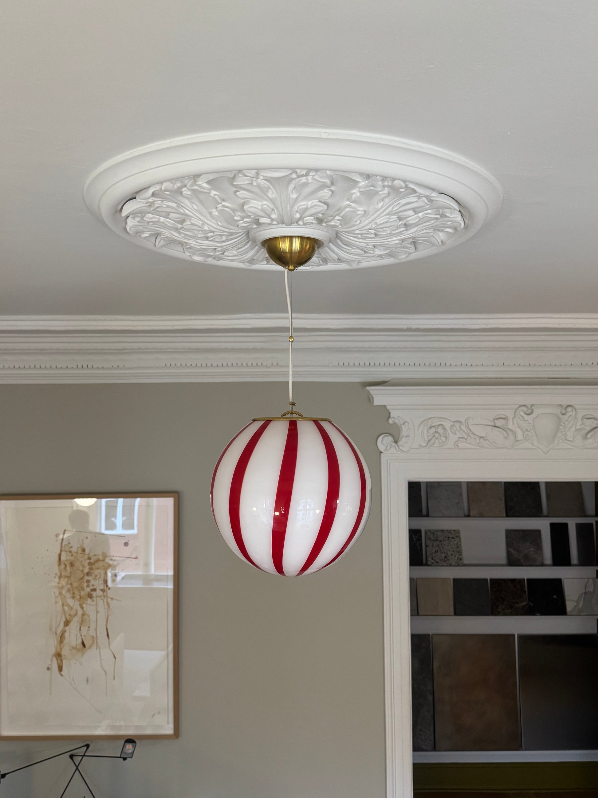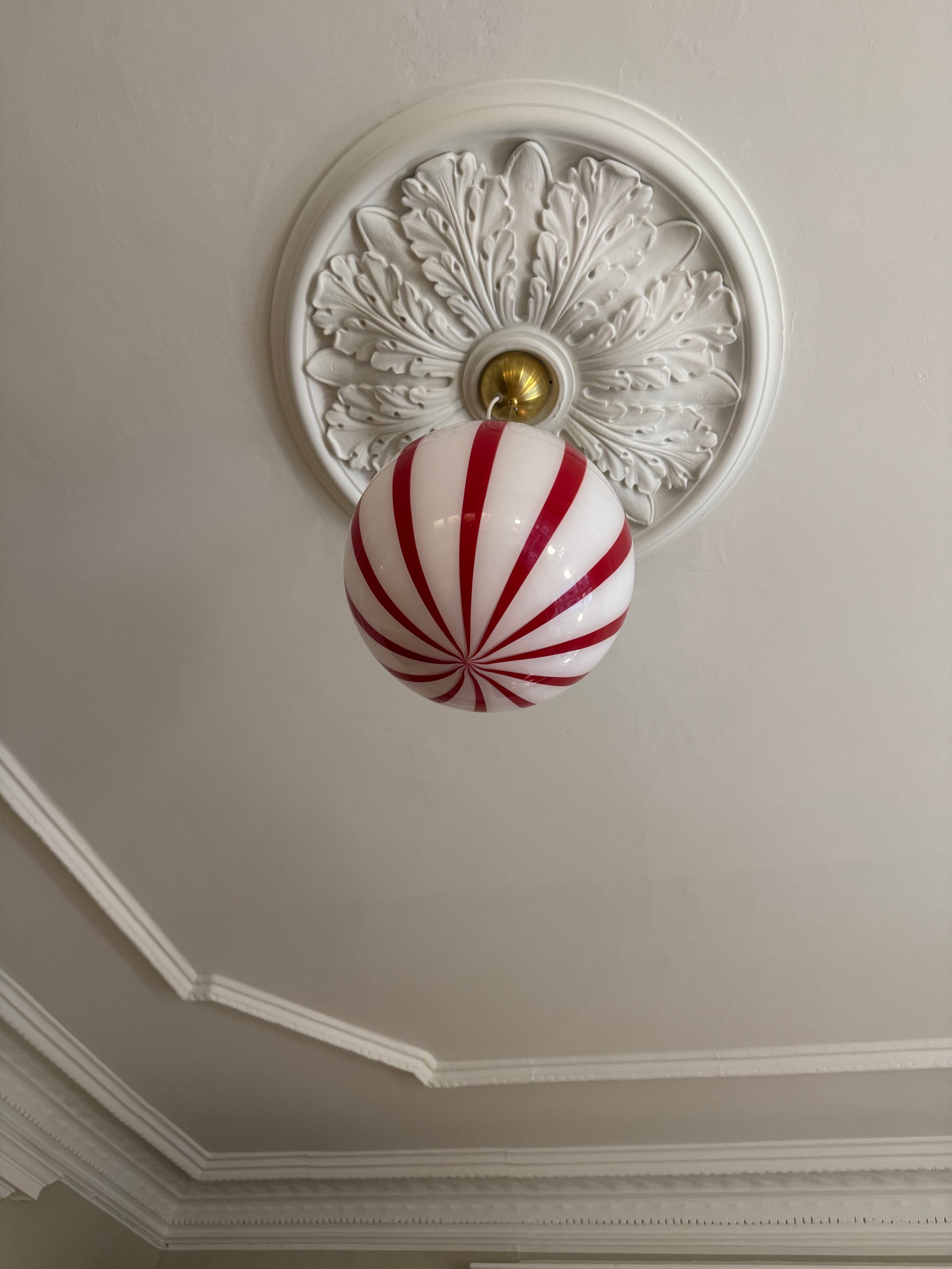 Smuk Murano candy/bolche loftslampe i hvid og rød med et smukt ophæng i messing.