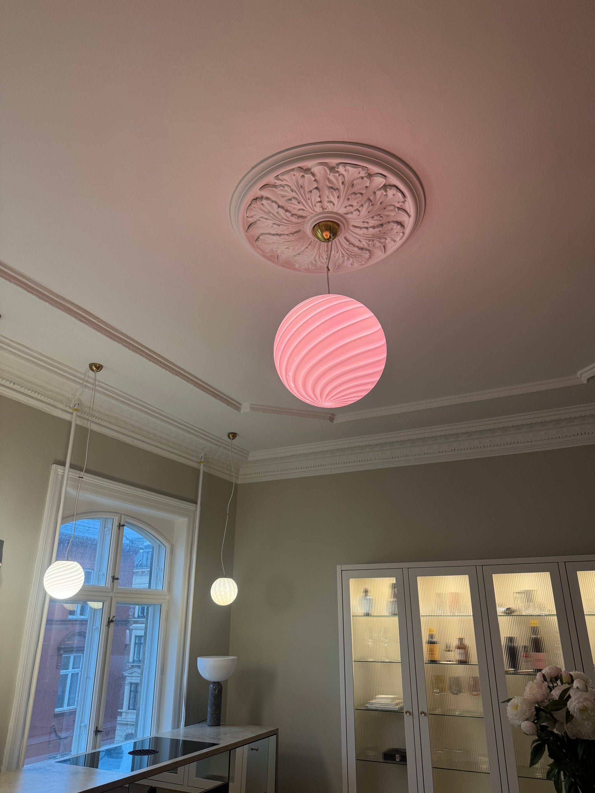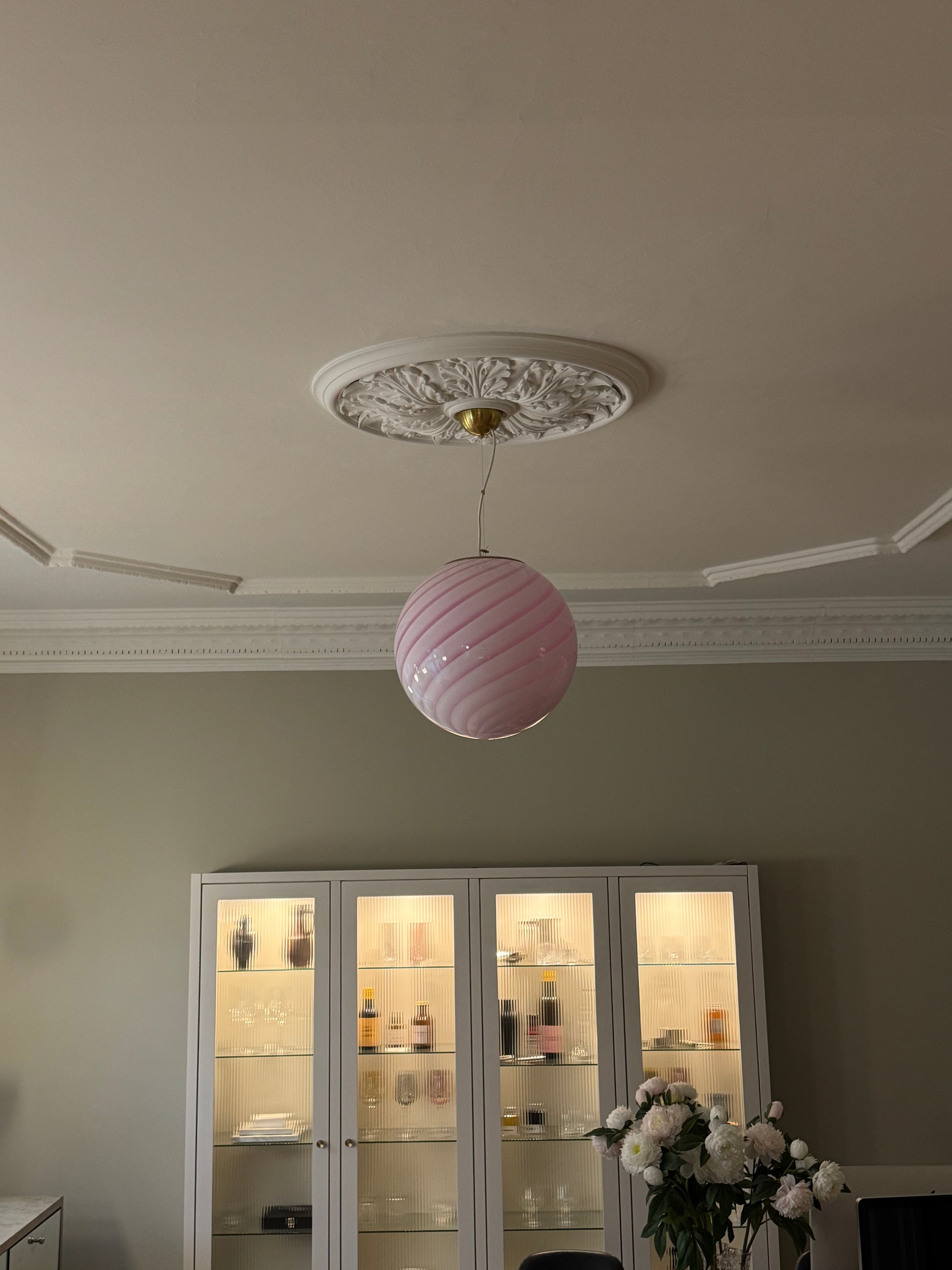 Smukkeste (og store) lyserøde Murano loftslampe i en rund form på 40 cm 😍 Den kommer med et rigtig flot ophæng i enten patineret messing eller stål/sølv.