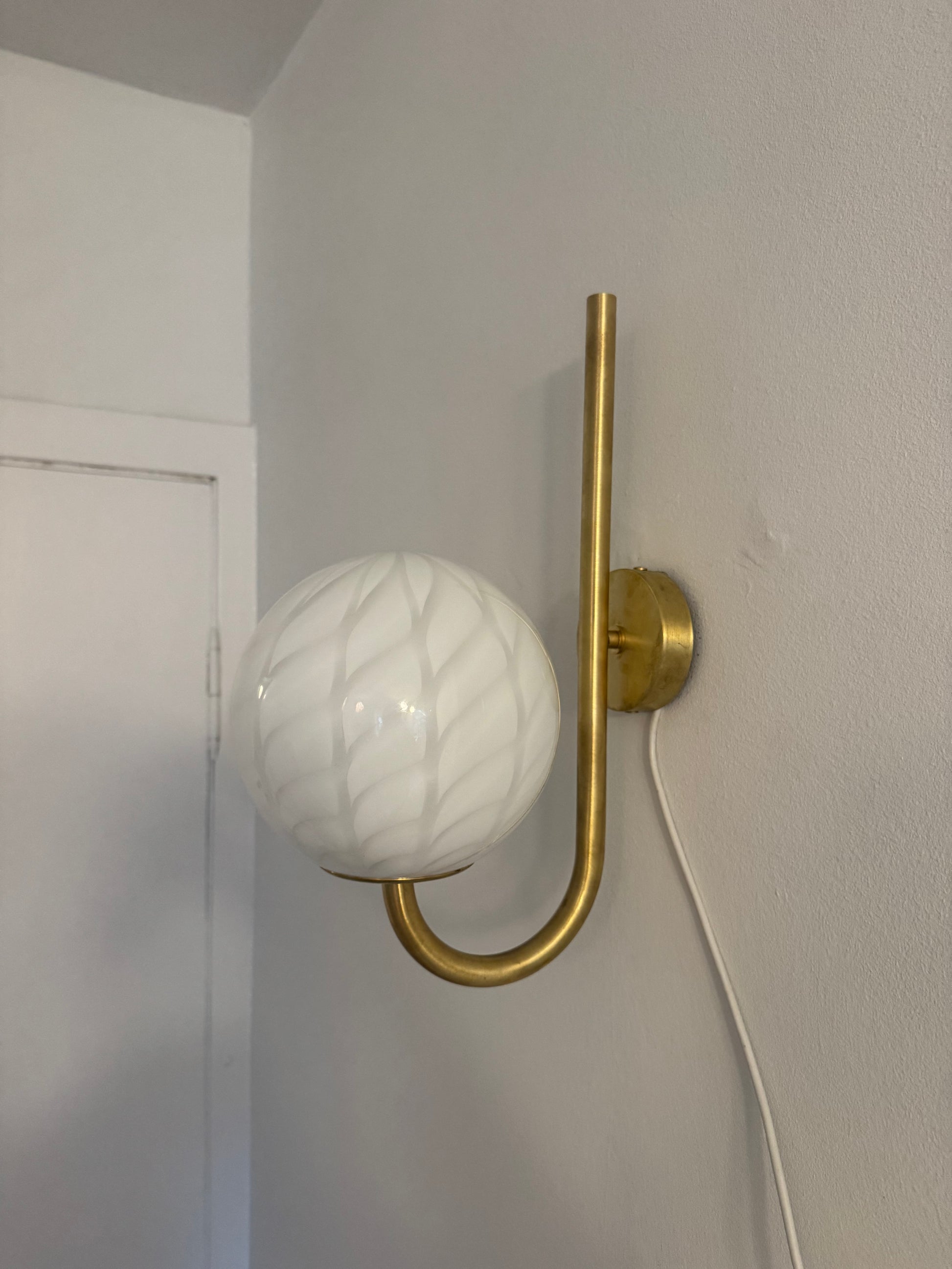 Flotteste Murano væglampe med messing beslag. Højden er 44 cm og kuglen har en diameter på 20 cm. Lampen kan vende begge veje.