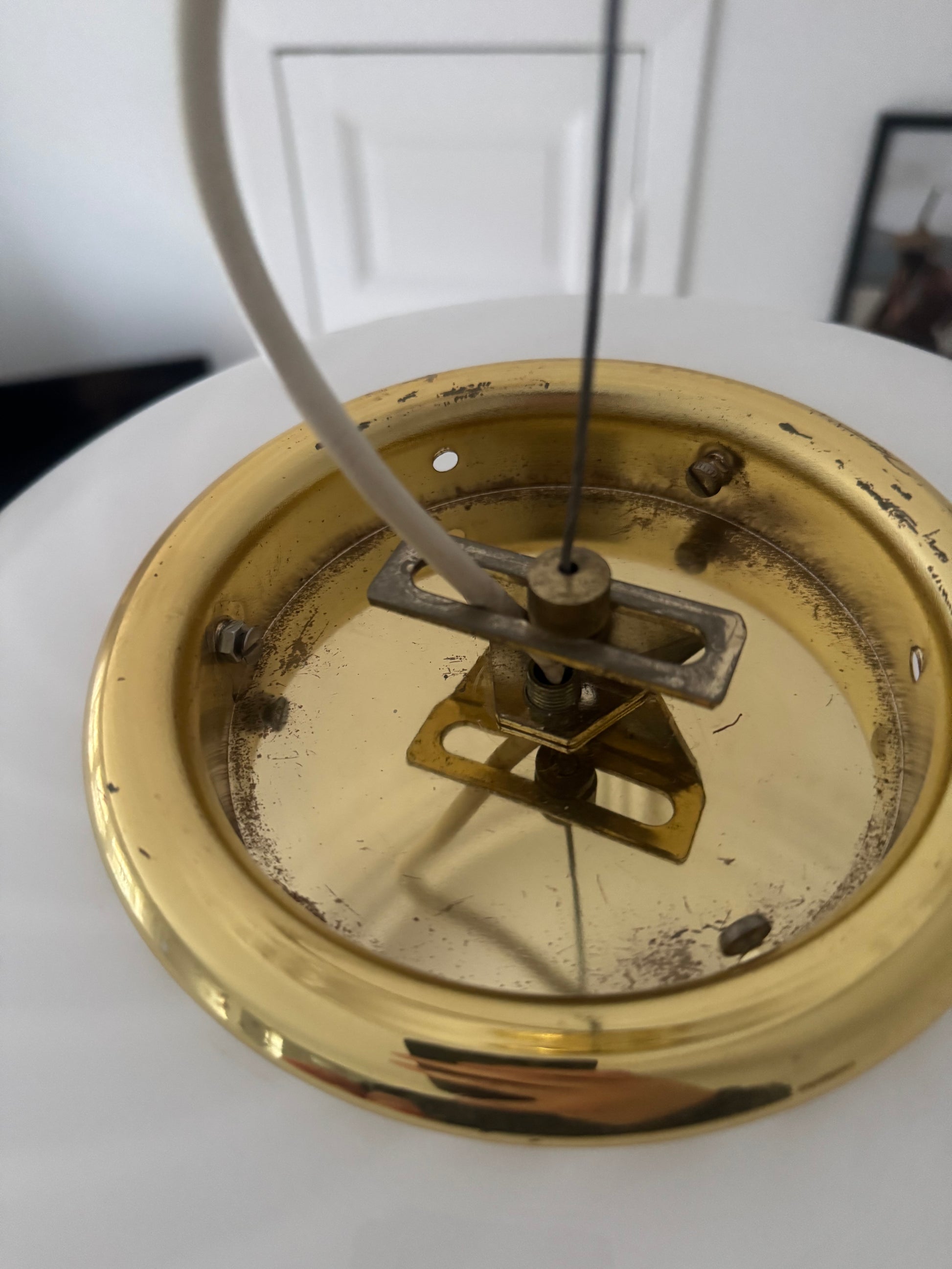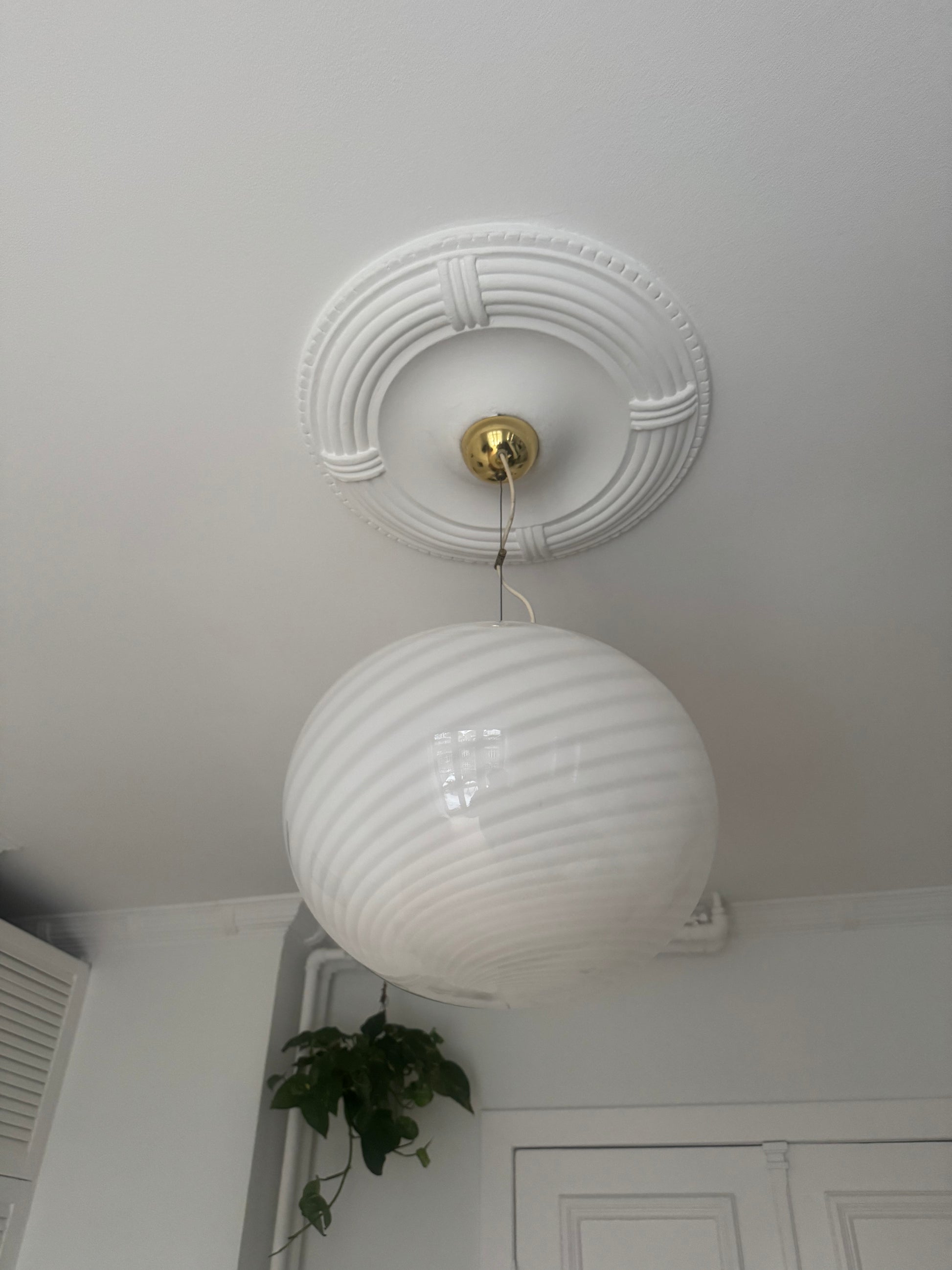 Stor og smuk vintage Murano pendel fra ca. 1970’erne. Den har det smukkeste hvide glas i en oval form. Den passer perfekt i både stue, soveværelse eller henover spisebordet.