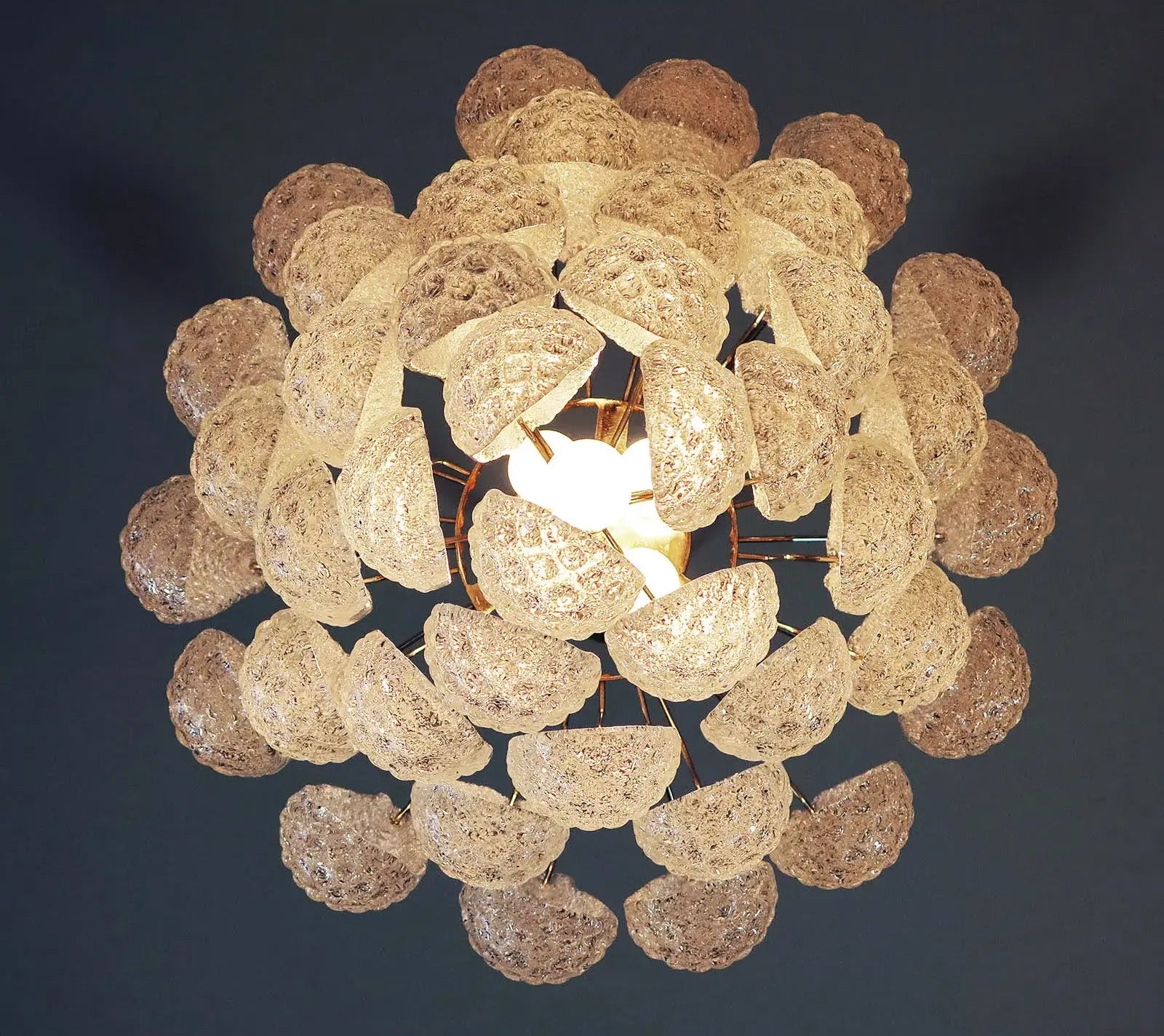 Skab en atmosfære af ægte italiensk elegance med vores eksklusive vintage Murano-lysekrone fra 70/80'erne. Den er sirligt fremstillet og består af 41 håndlavede, klare glasblade, som er glatte på ydersiden og behandlet med krystalpulver samt let ru på indersiden for at fremhæve lysets dybde og spil.