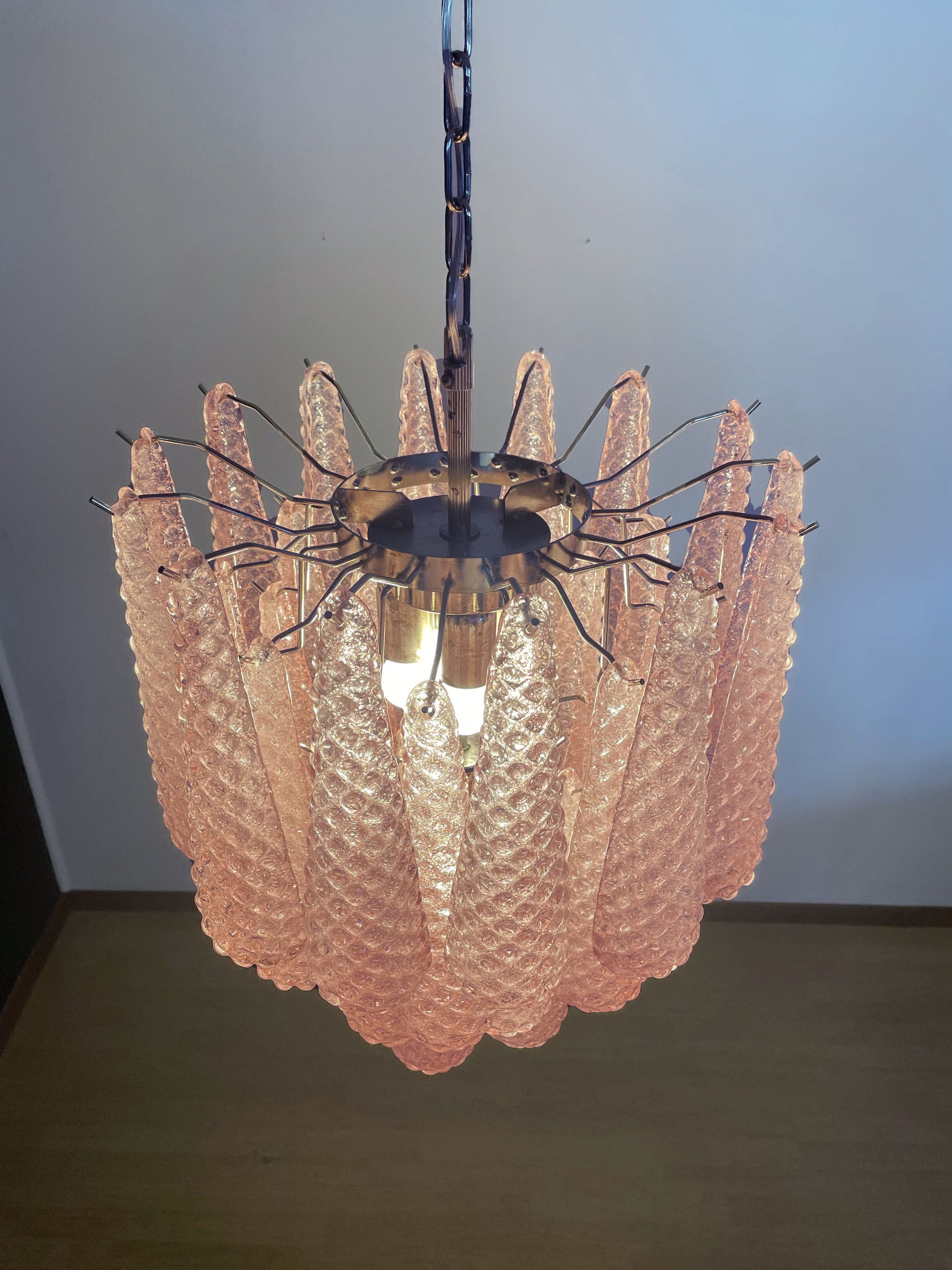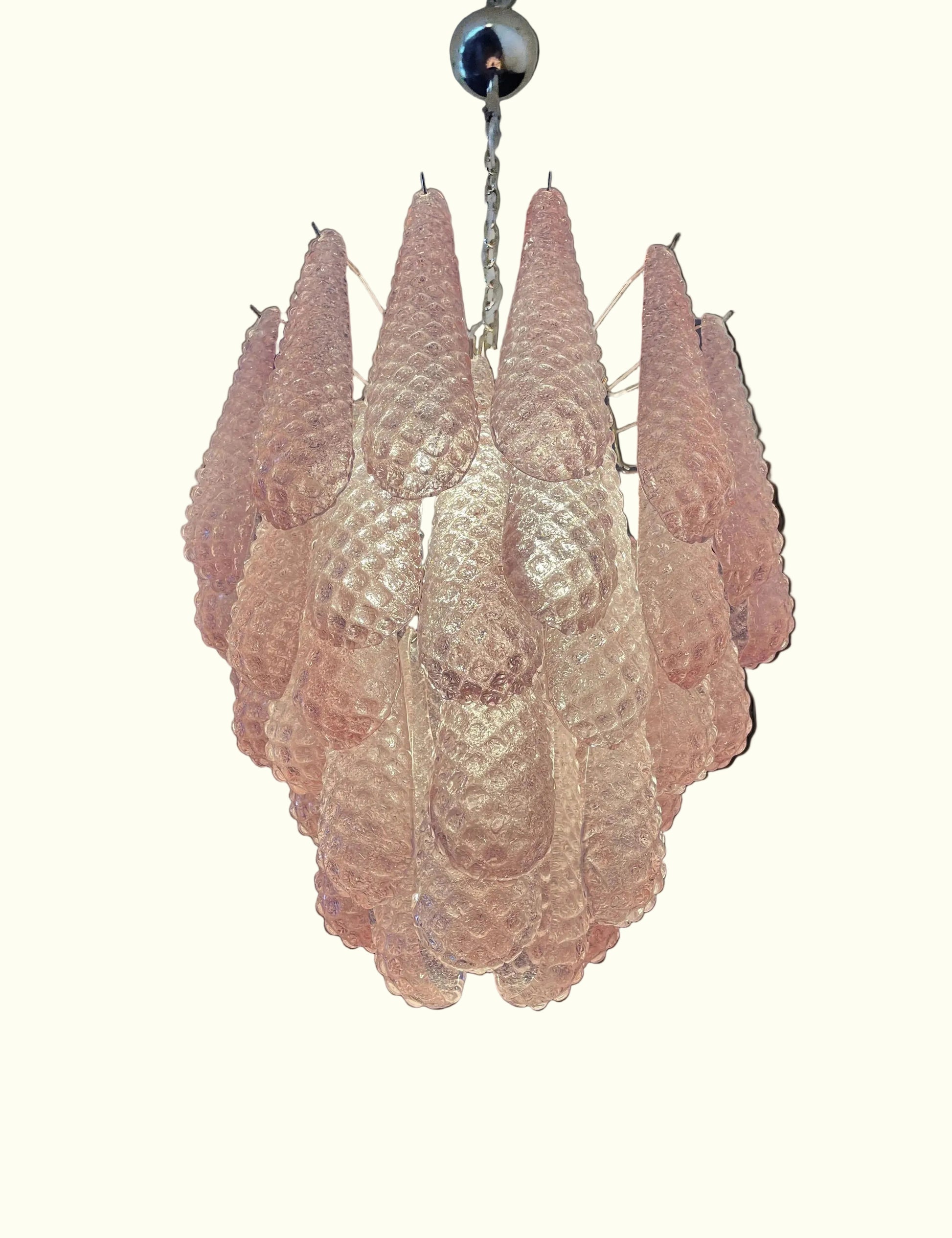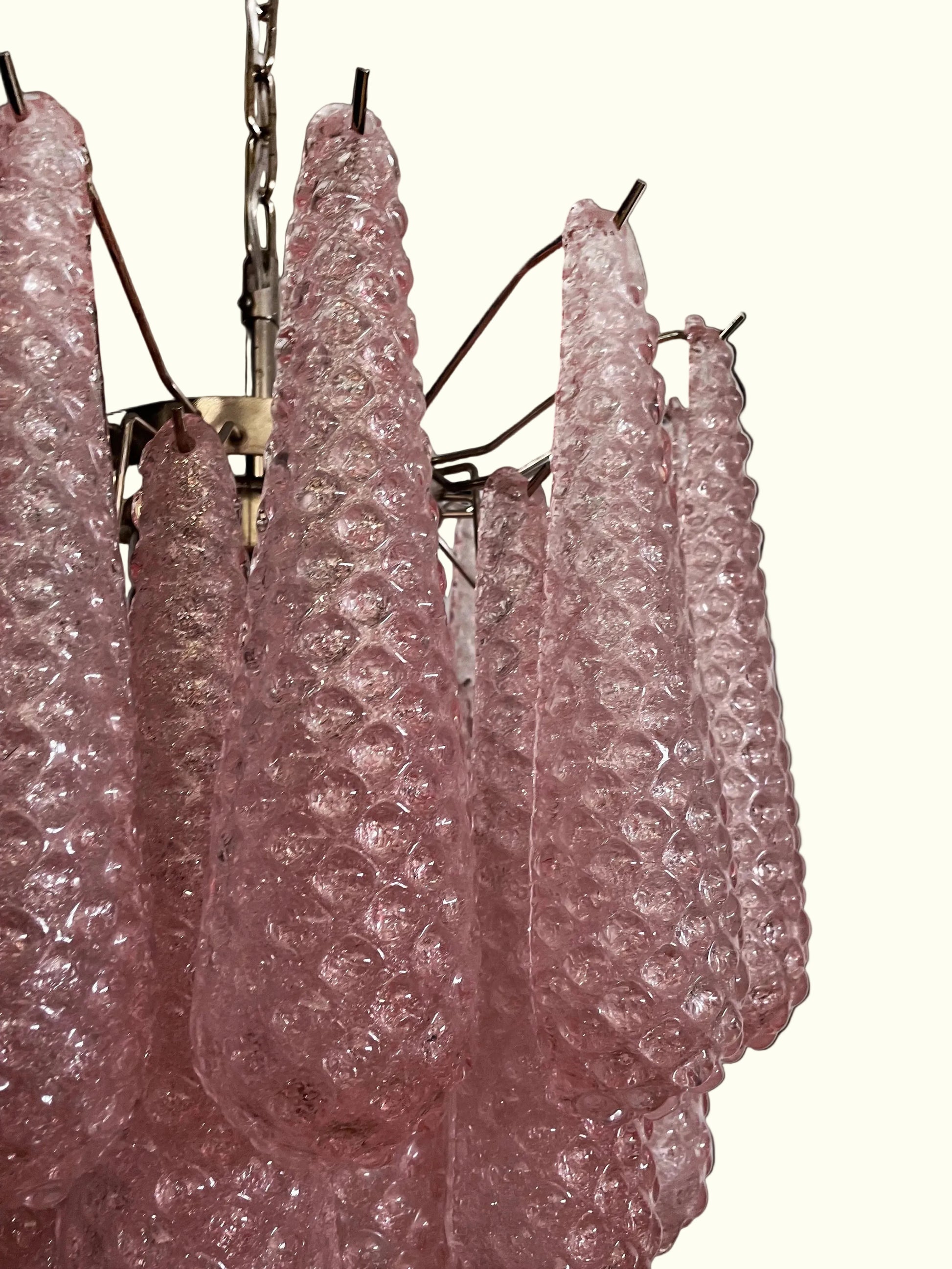 Smukkeste italienske vintage Murano lysekrone lavet af 41 glasblade (lyserød krystal, glat udvendigt, med krystalpulver og derefter ru indvendigt) i en forkromet ramme. Den fremstår i perfekt vintage stand og er fuldt funktionsdygtig. Hvert af de smukke glasblade måler 31 x 8 cm.