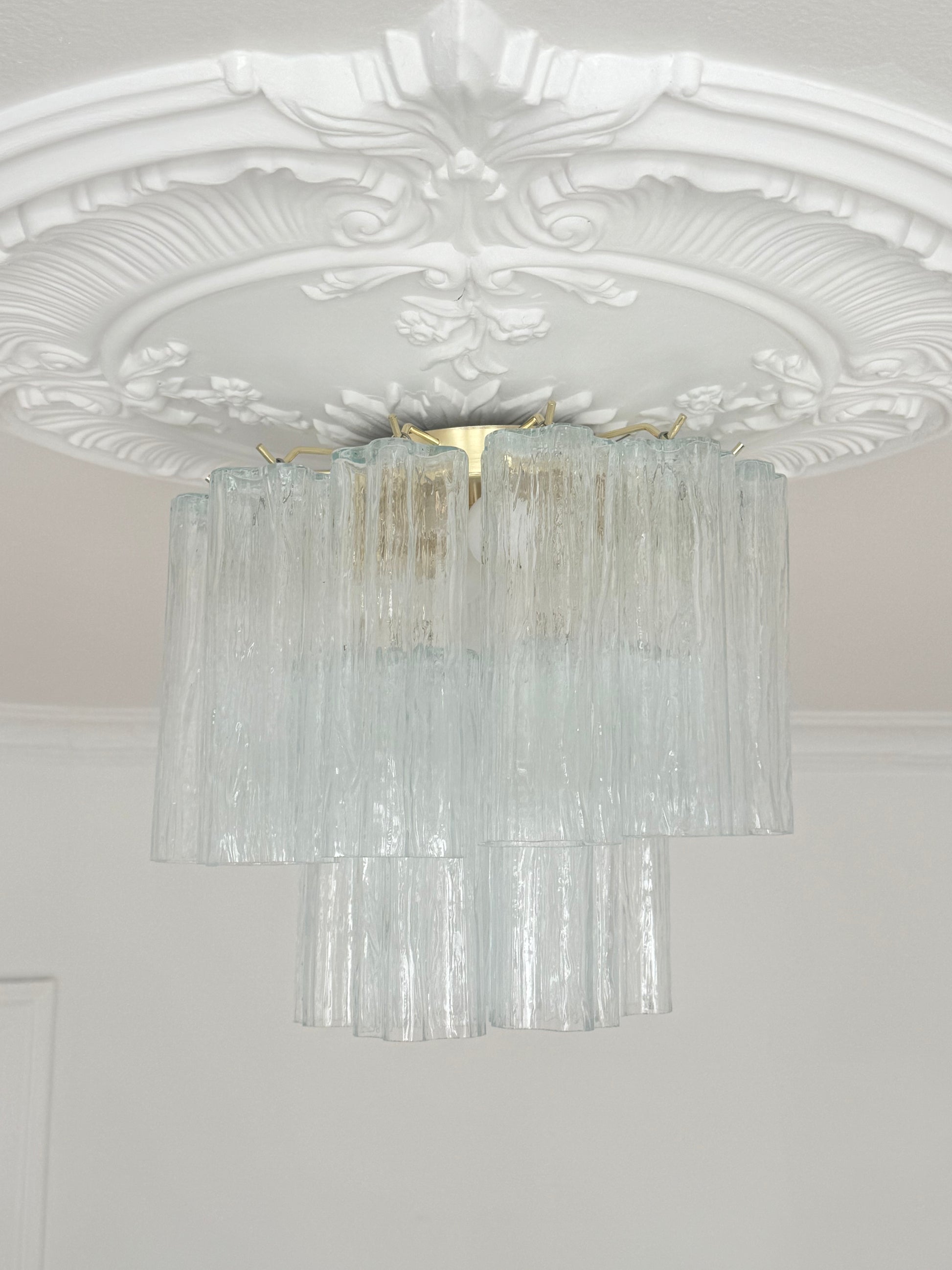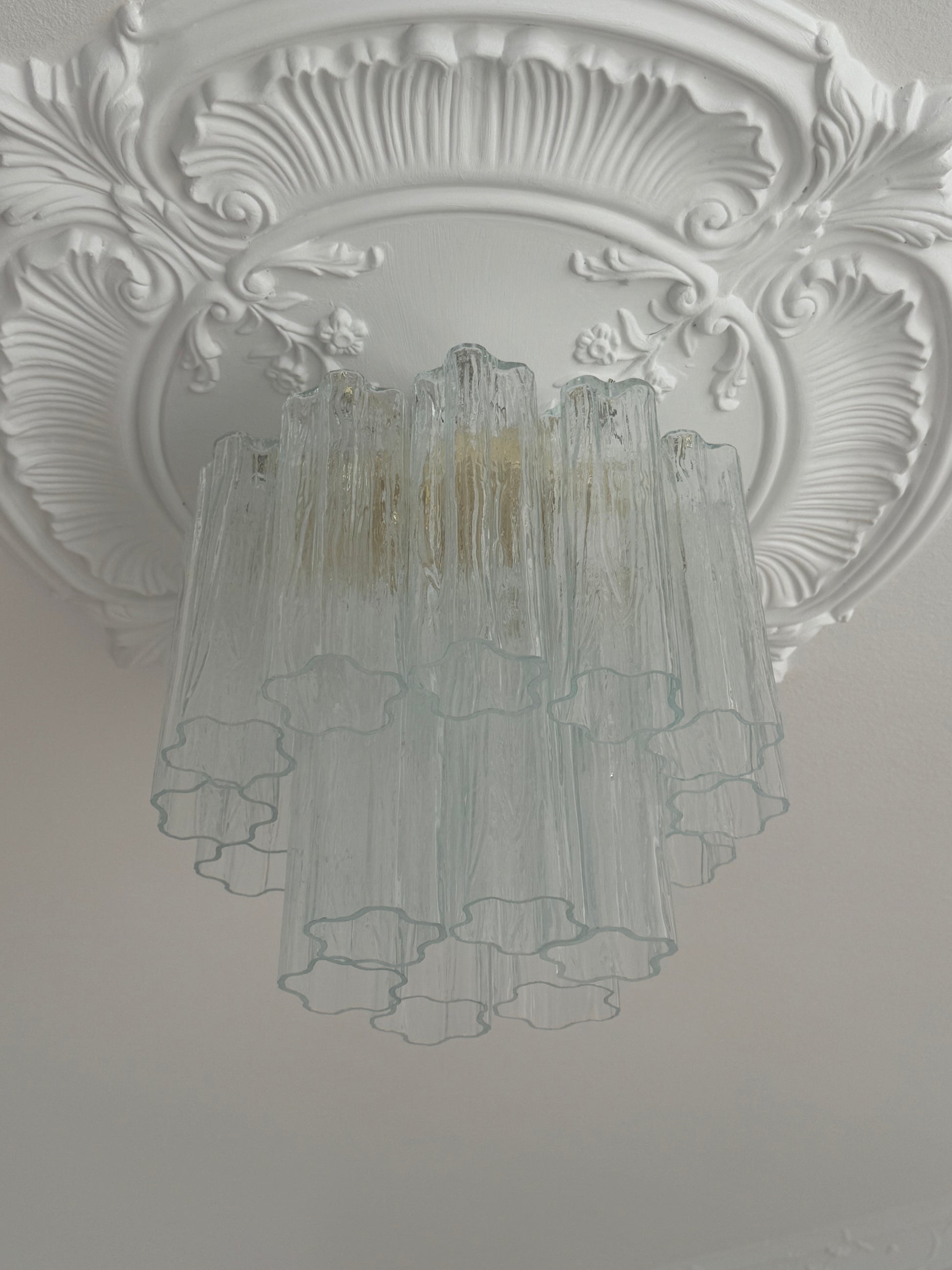 Elegant loftlampe/lysekrone fremstillet i ægte Murano glas i det karakteristiske Tronchi-design. Lampen er produceret i Italien og kombinerer klassisk vintage-stil med tidløst håndværk. De klare, mundblæste glasrør skaber et eksklusivt og dekorativt udtryk, der passer perfekt over spisebordet, i stuen eller i entréen.