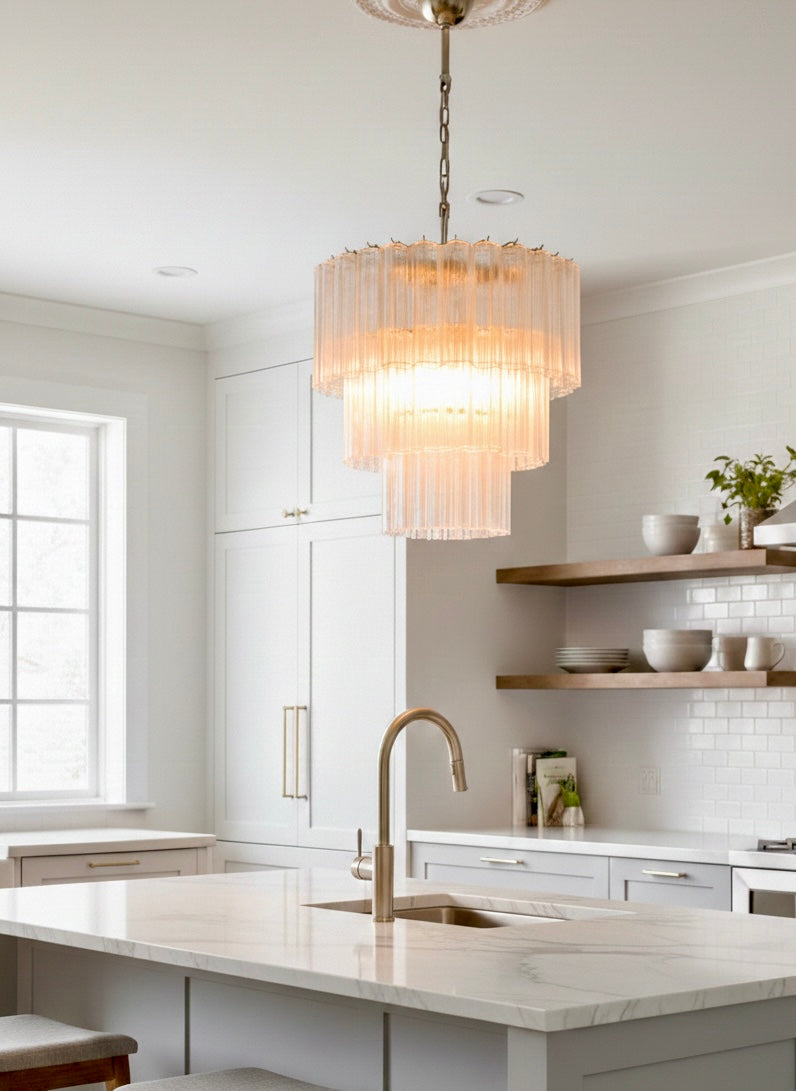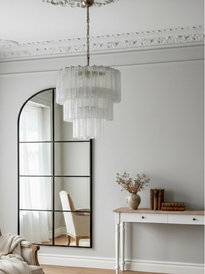 Glasset fremstår klart med en let struktureret overflade, der bryder lyset på fortryllende vis. Når lampen er tændt, spreder den et varmt, gyldent skær, som skaber en indbydende og eksklusiv atmosfære i rummet. De mange tuber filtrerer lyset blødt og giver en levende, næsten funklende effekt. Med sine mundblæste glastuber er denne Murano-lysekrone et smukt eksempel på italiensk glaskunst – ideel over et spisebord, i en hall eller som et dekorativt midtpunkt i en stue.