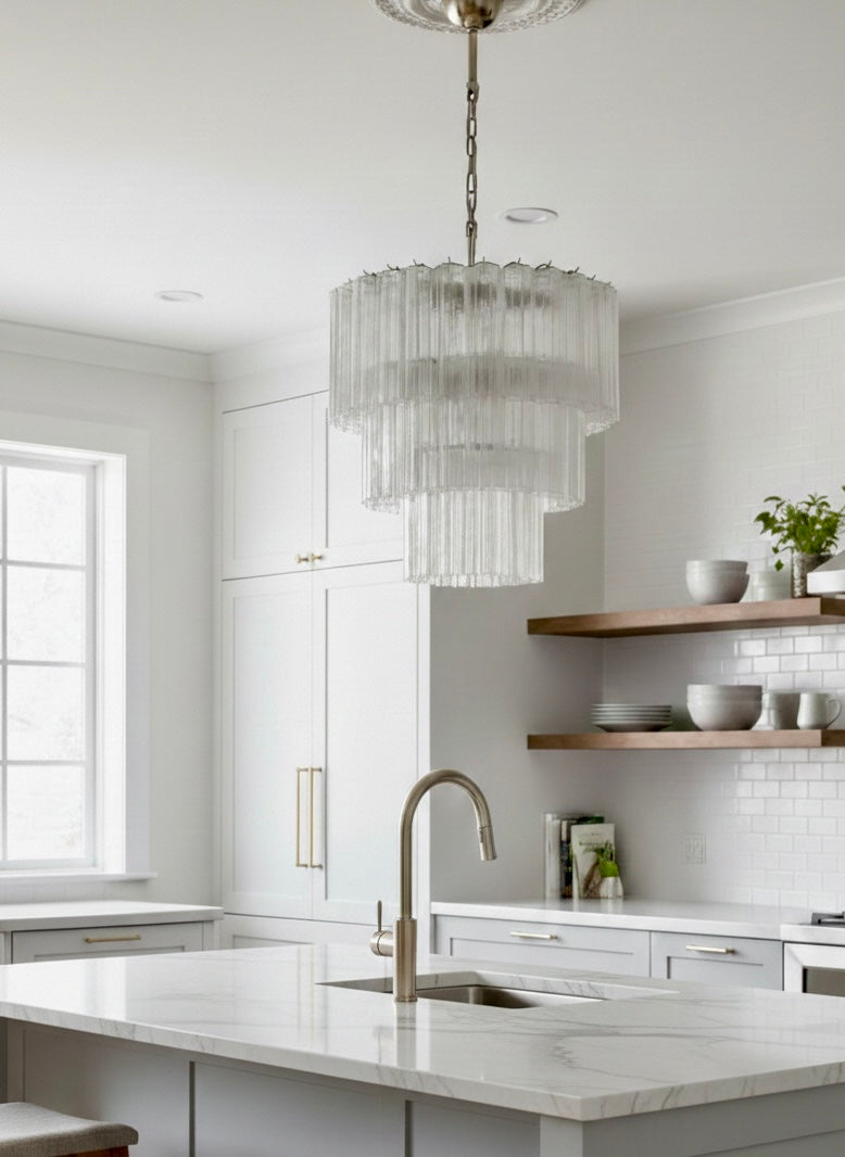 Denne imponerende Murano-lysekrone med 52 glastuber er et elegant statement piece, der kombinerer klassisk italiensk håndværk med et sofistikeret, moderne udtryk. De slanke, vertikalt arrangerede glastuber danner en smuk, lagdelt silhuet, som giver lysekronen en harmonisk og balanceret form.