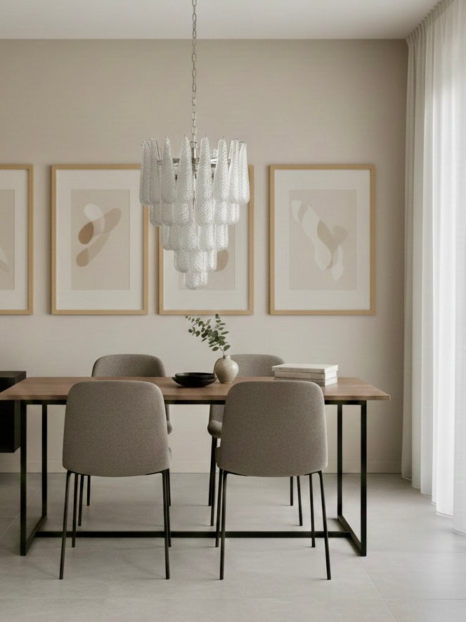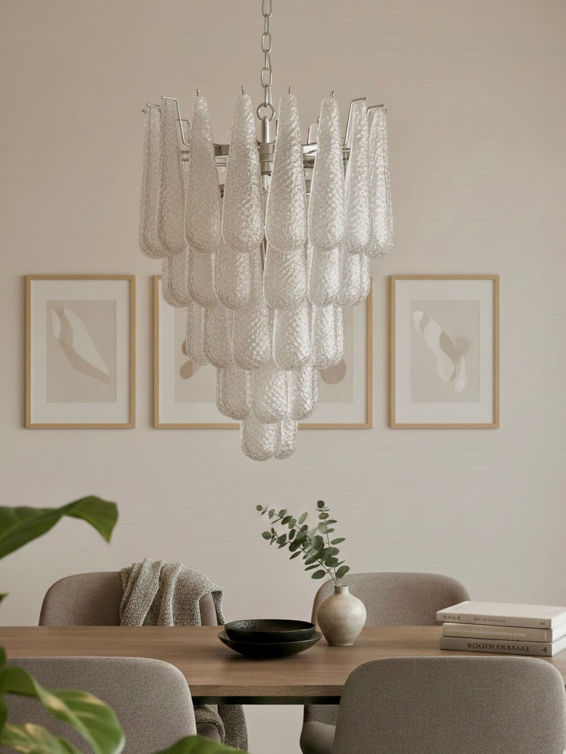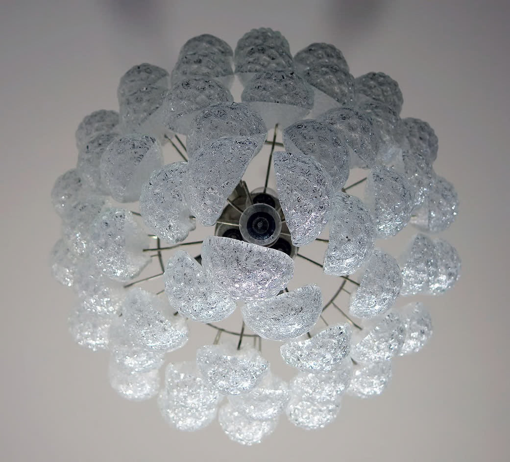 Stor italiensk Murano-lysekrone med 52 glasblade i klar krystal – glatte på ydersiden og med krystalpulver, der skaber en smukt ru struktur på indersiden. Denne eksklusive model forener tidløs elegance med enestående håndværk og spreder et blødt, indbydende lys, der skaber en luksuriøs atmosfære i ethvert rum. Lad dine omgivelser oplyses af denne betagende Murano-lysekrone – en harmonisk sammensmeltning af klassisk kunsthåndværk og moderne design.