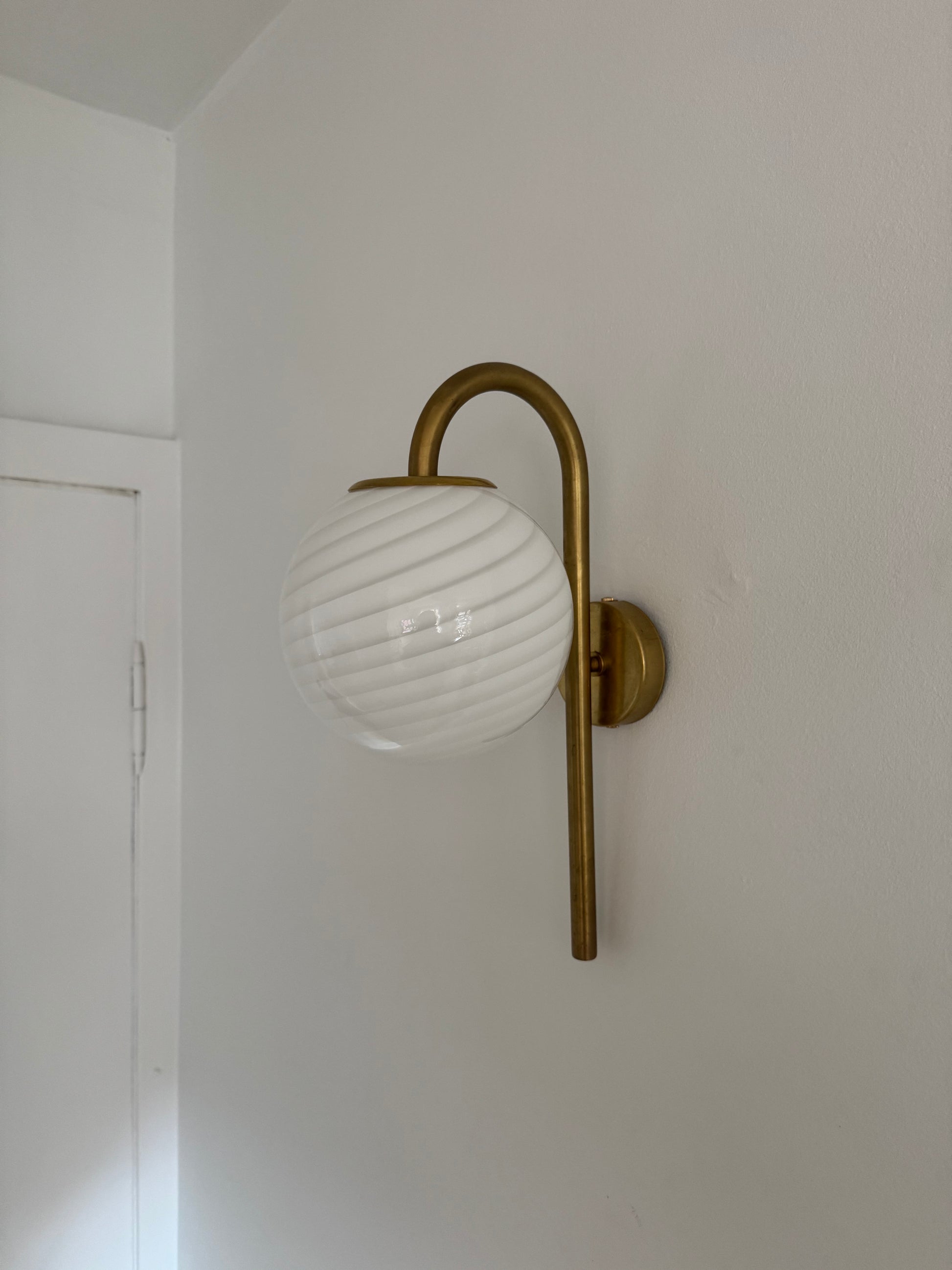 Flotteste Murano væglampe med messing beslag. Højden er 44 cm og kuglen har en diameter på 20 cm. Lampen kan vende begge veje. Andre farver glas kan muligvis skaffes hjem på bestilling.