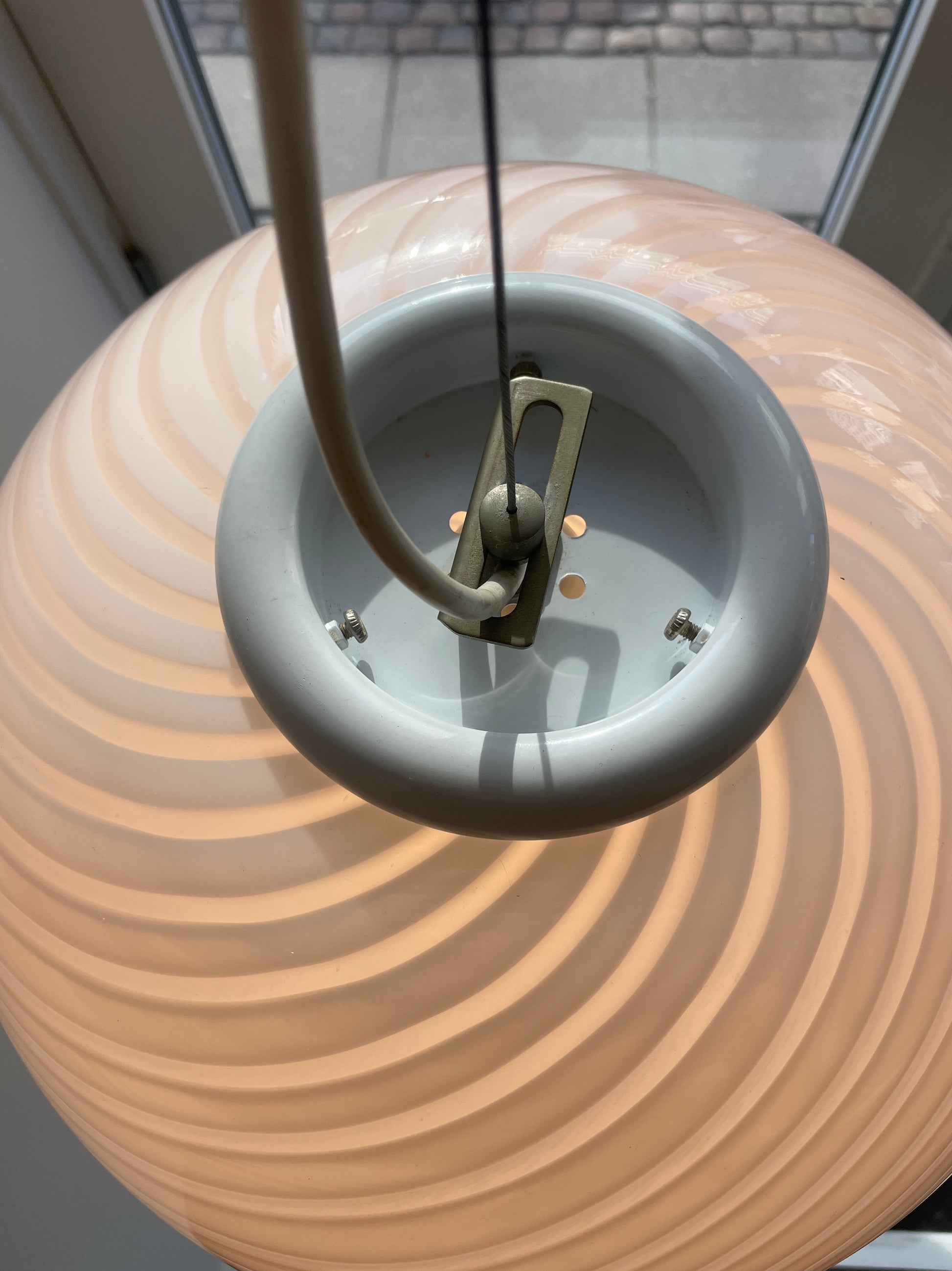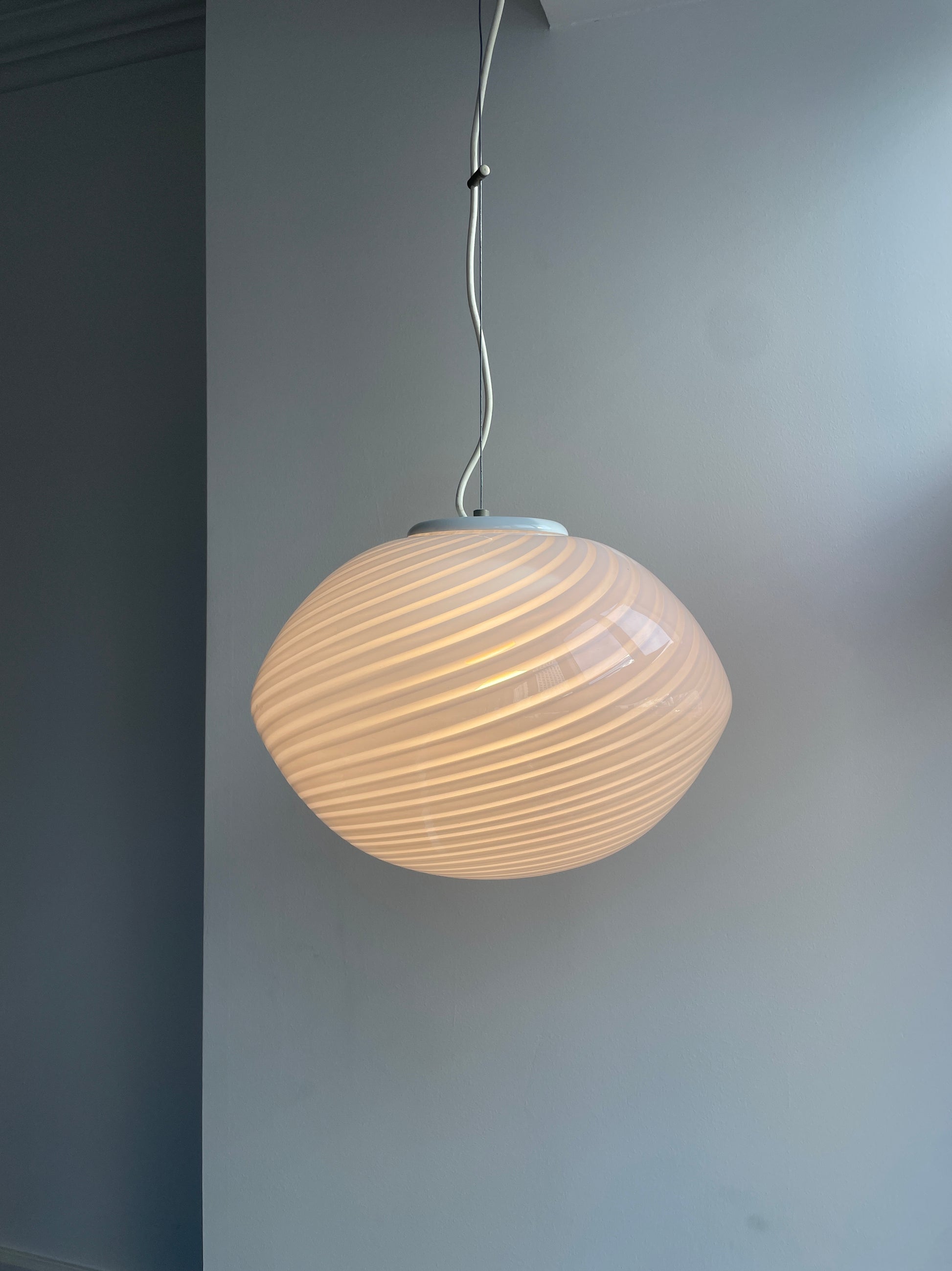 Flot vintage Murano loftlampe fra 1970’erne. Den har en lidt anderledes form og er mundblæst i det flotteste hvide glas. Den kommer med et flot hvidt ophængt.